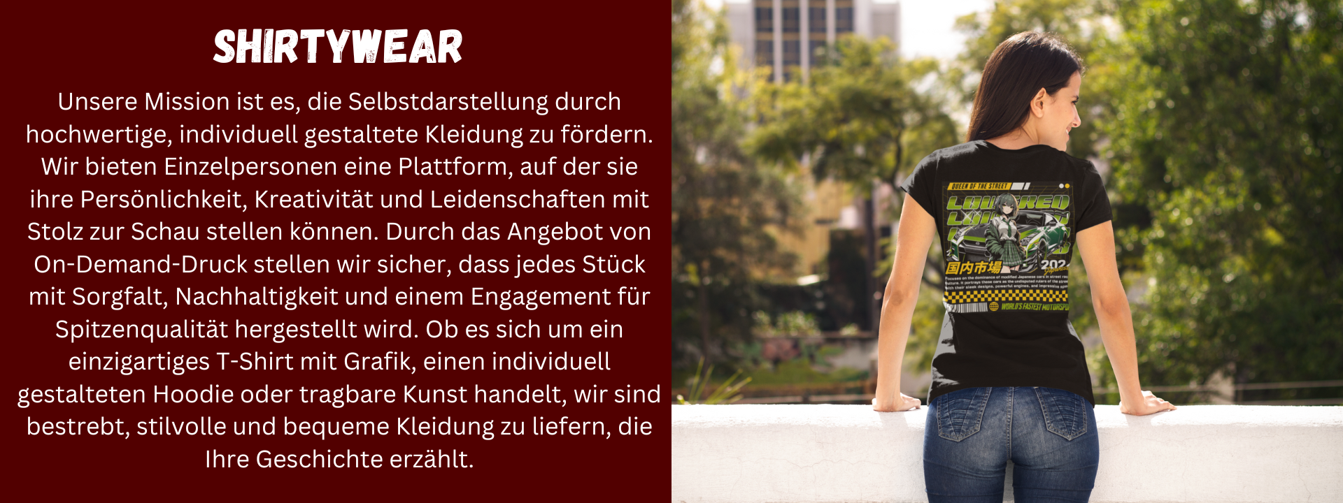 Bei ShirtyWear glauben wir daran, Mode einfach, spaßig und genau nach deinen Vorstellungen zu gestalten. Unser Print-on-Demand-Service bedeutet, dass jedes Produkt nur dann hergestellt wird, wenn du es bestellst. So stellen wir sicher, dass jedes Teil mit Sorgfalt und Liebe zum Detail gefertigt wird.