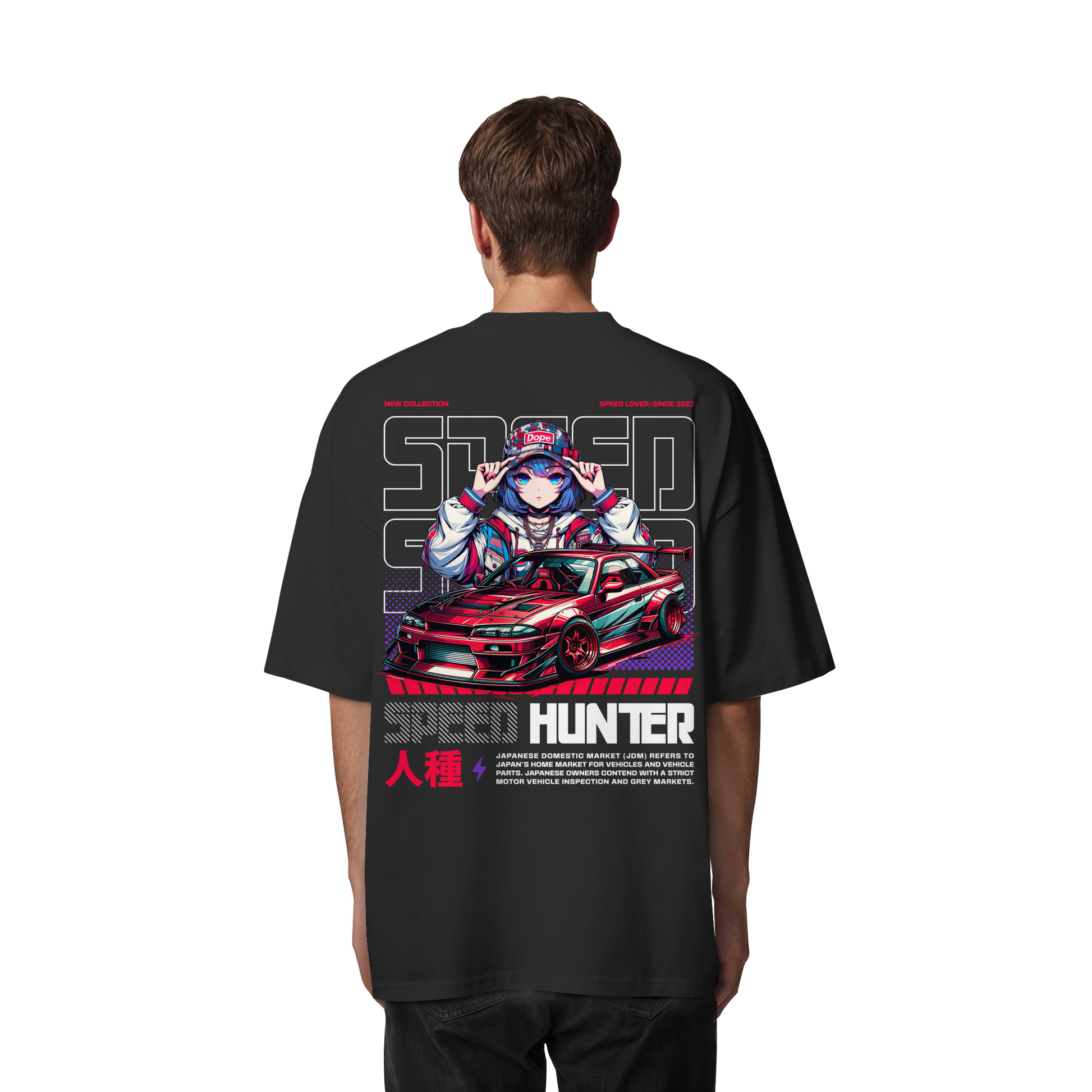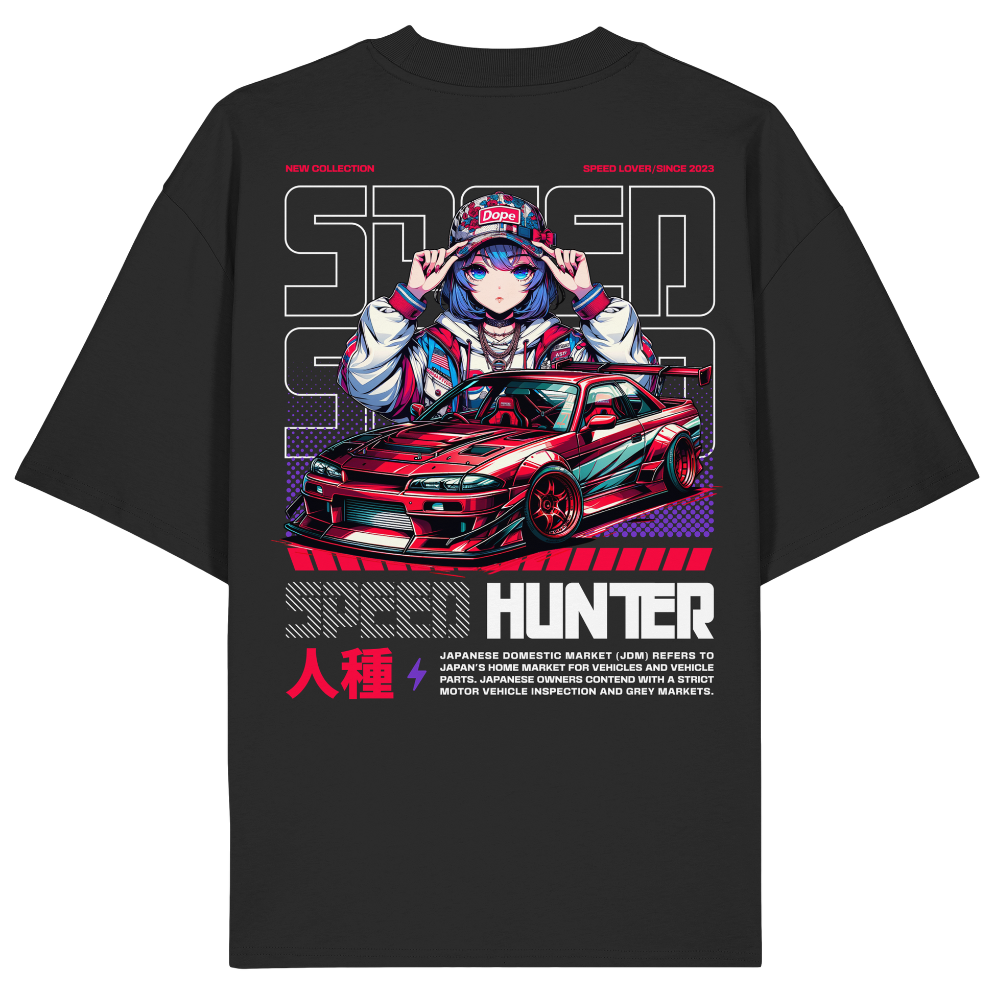 Das auffällige Motiv zeigt einen stilisierten Sportwagen und eine coole Anime-Figur. Die dynamischen Linien und leuchtenden Farben erzeugen ein Gefühl von Geschwindigkeit und Abenteuer.