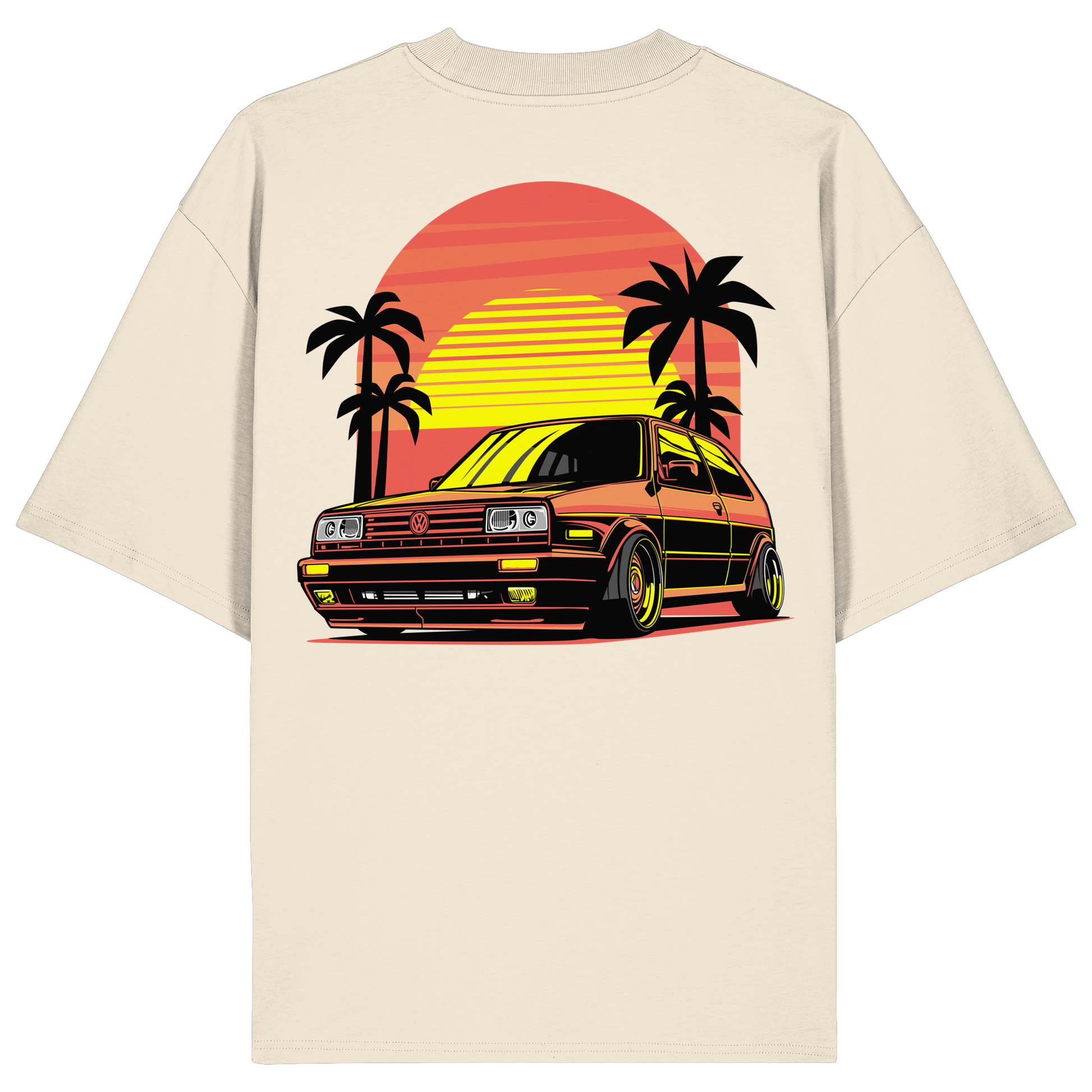 Das Design zeigt einen klassischen Wagen vor einem leuchtenden Sonnenuntergang, umrahmt von Palmen. Die kräftigen Gelb- und Orangetöne schaffen eine warme und lebendige Stimmung.
