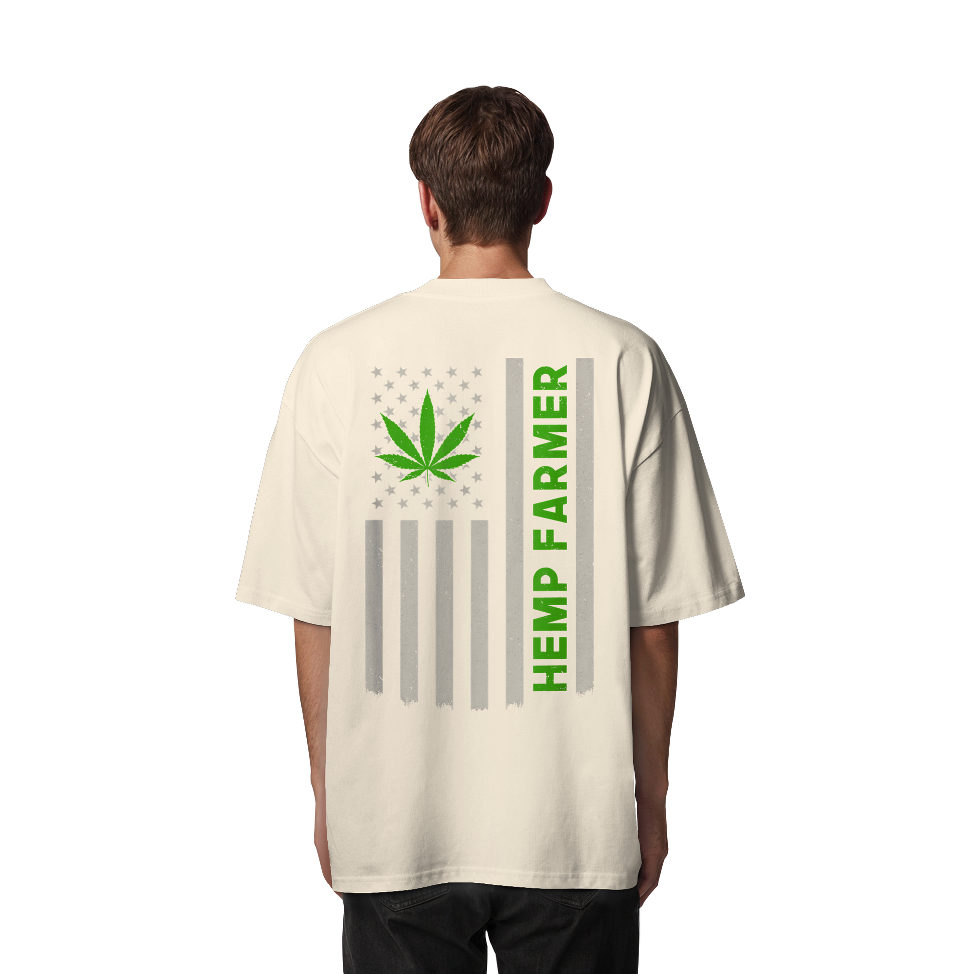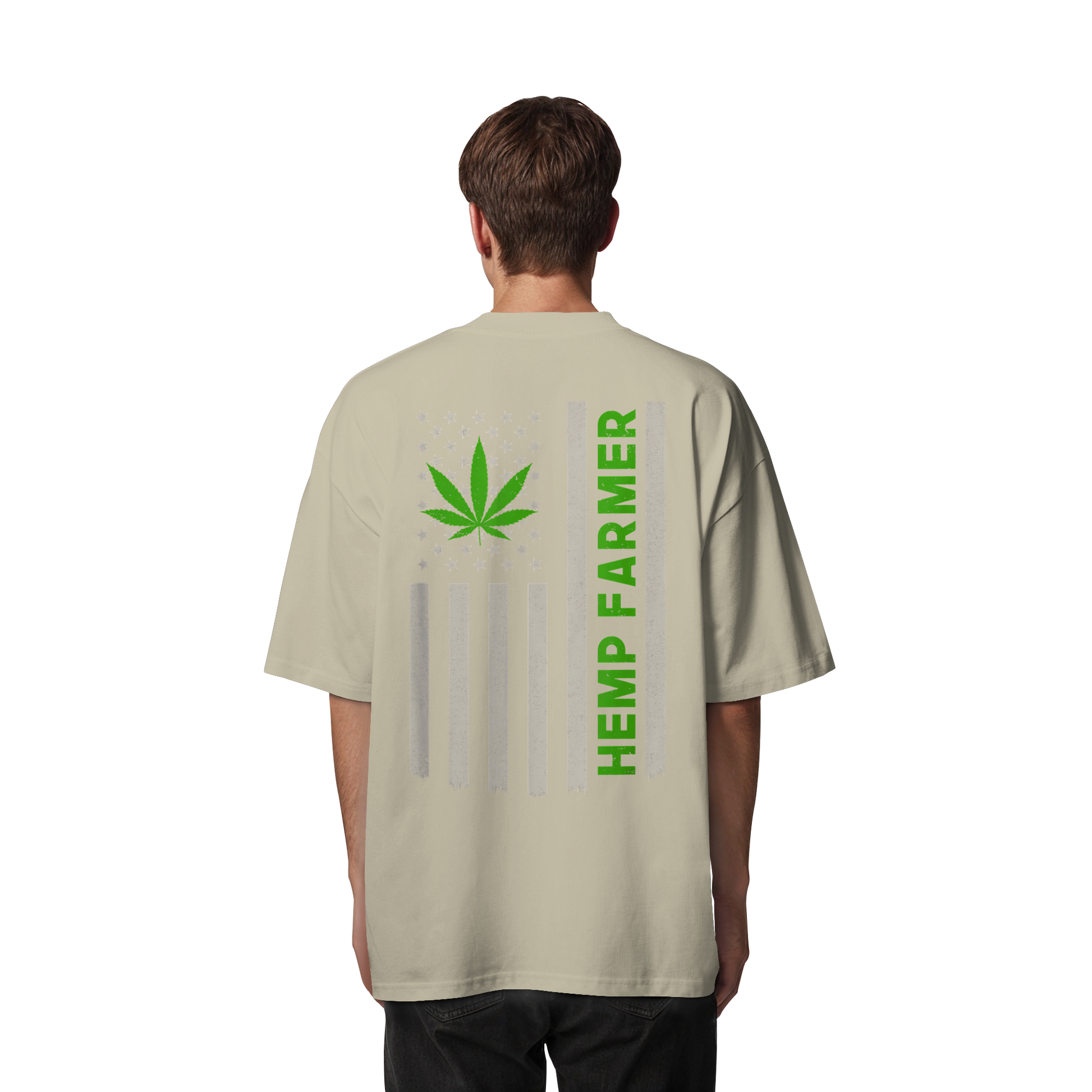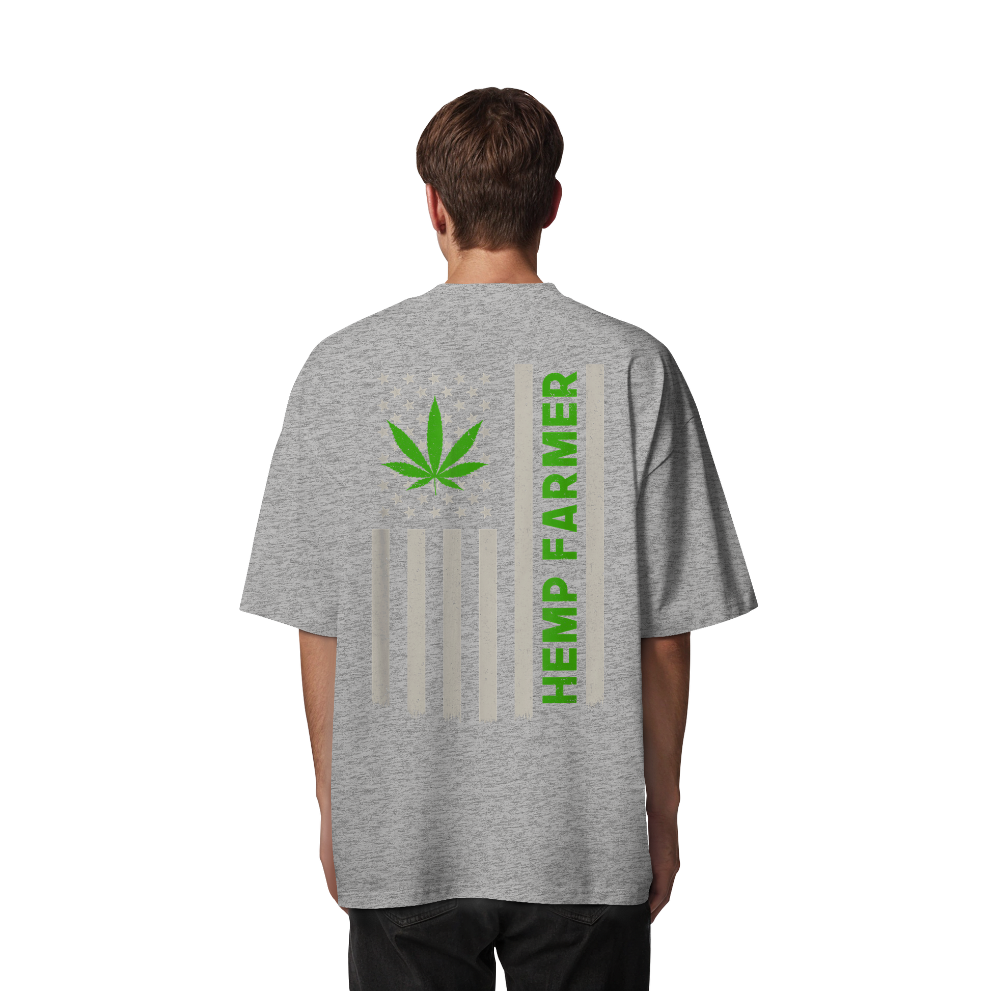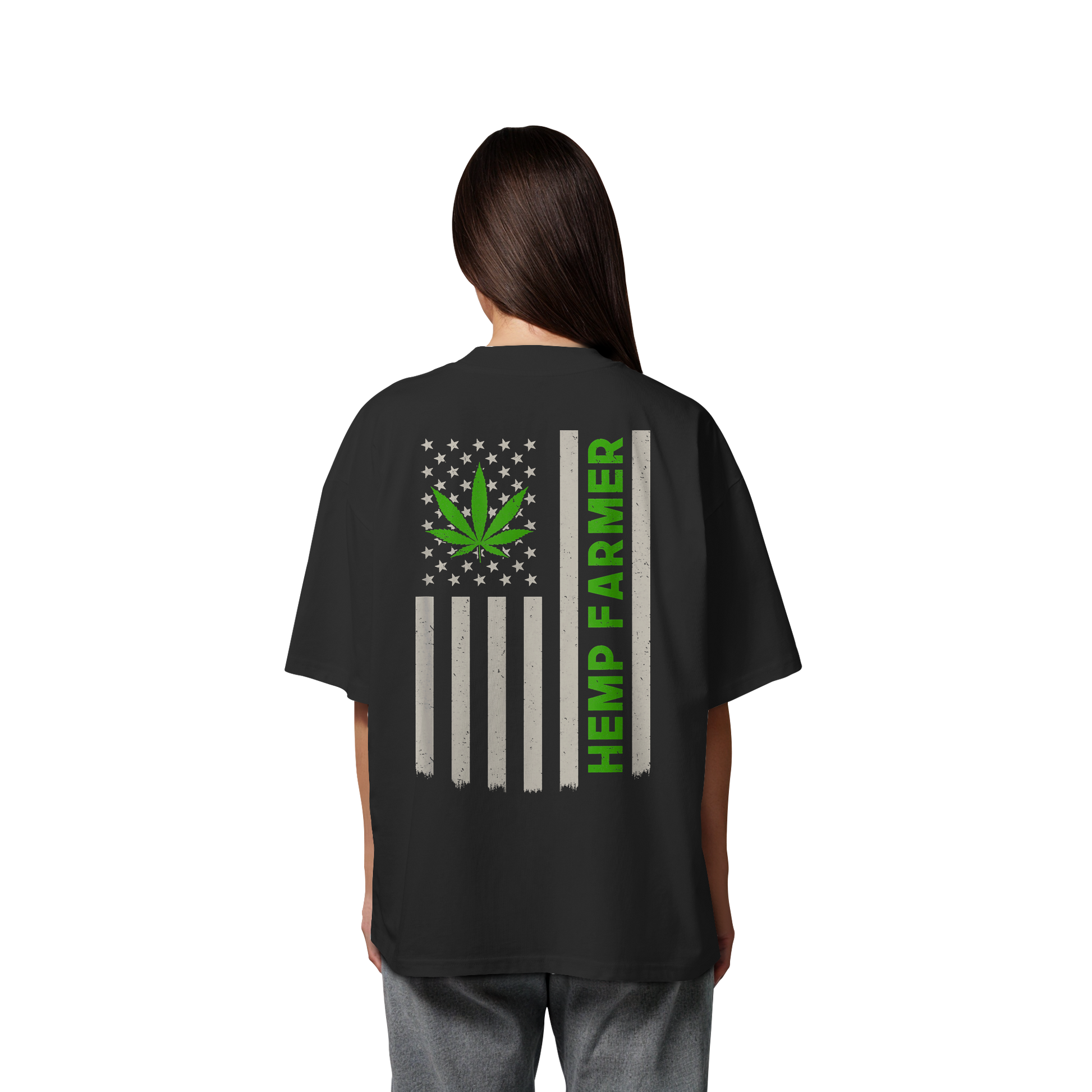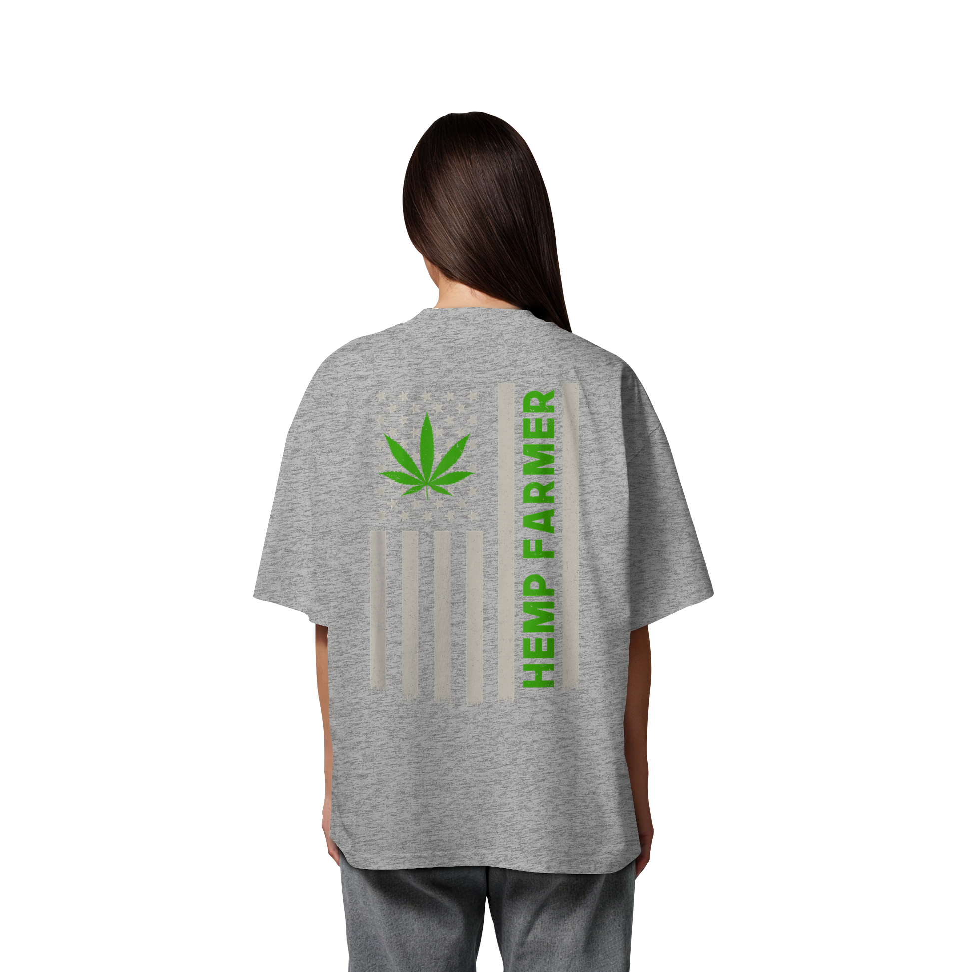 Mit einem grünen Hanfblatt-Motiv und vertikalen Streifen, inspiriert von patriotischen Themen, bringt dieses Shirt eine kraftvolle Botschaft. Der Text "HEMP FARMER" in kräftigem Grün verstärkt das natürliche und nachhaltige Thema.