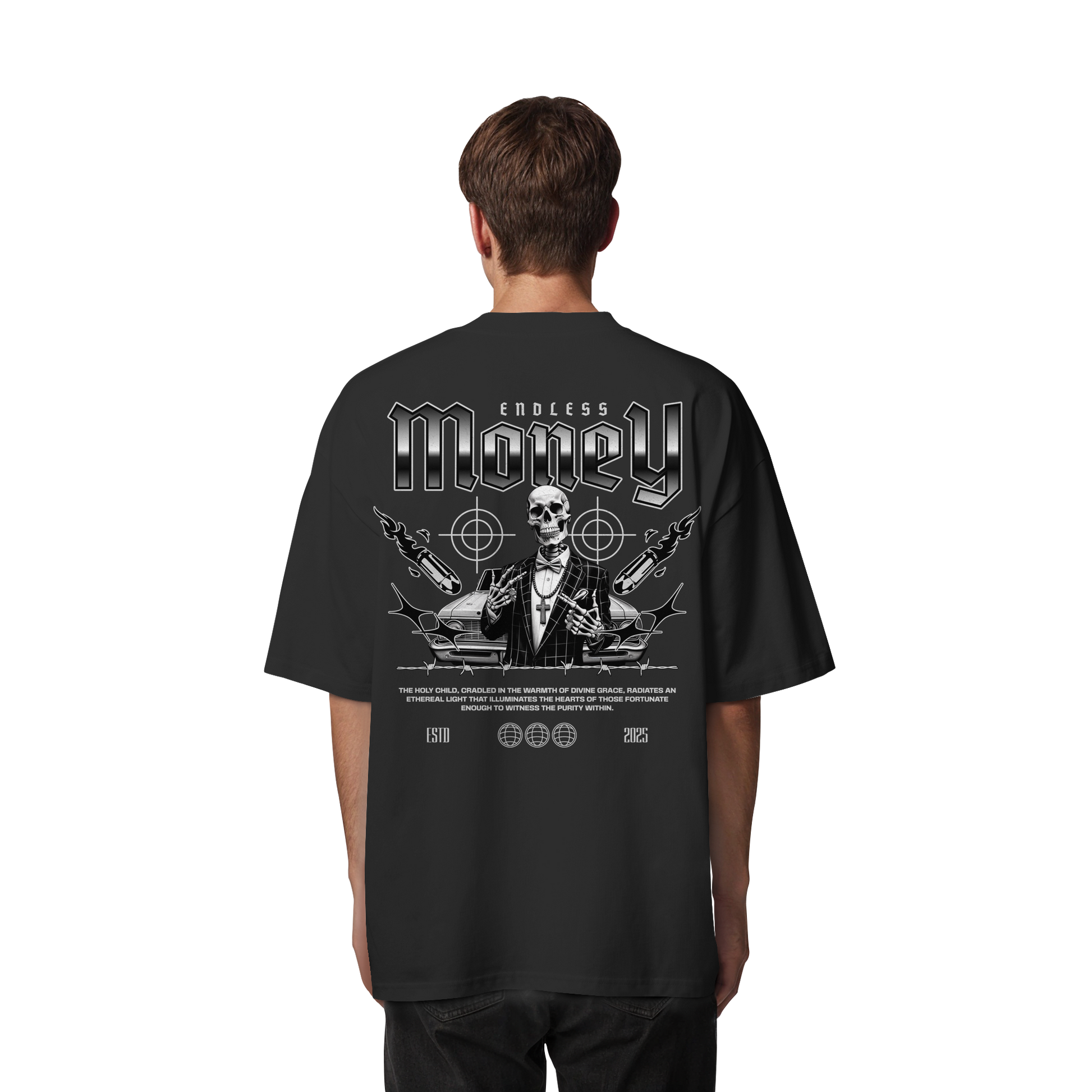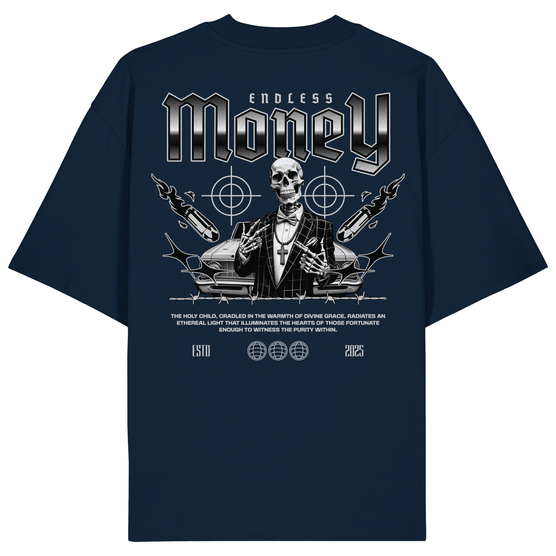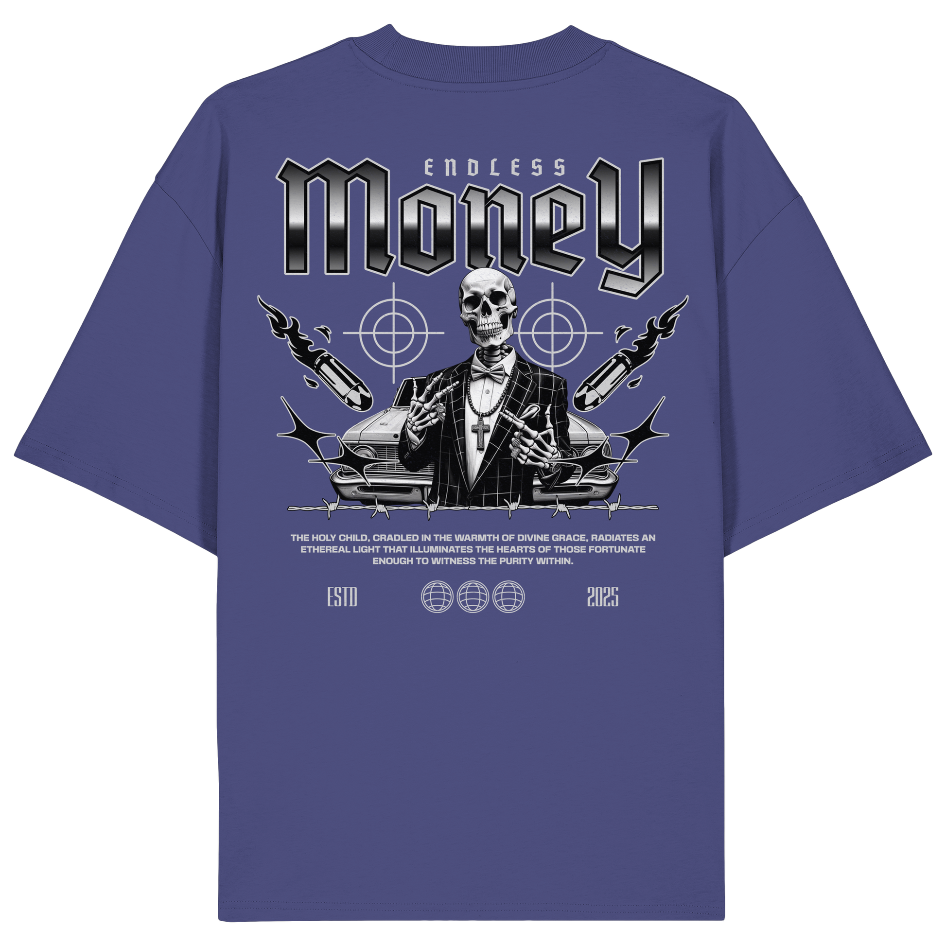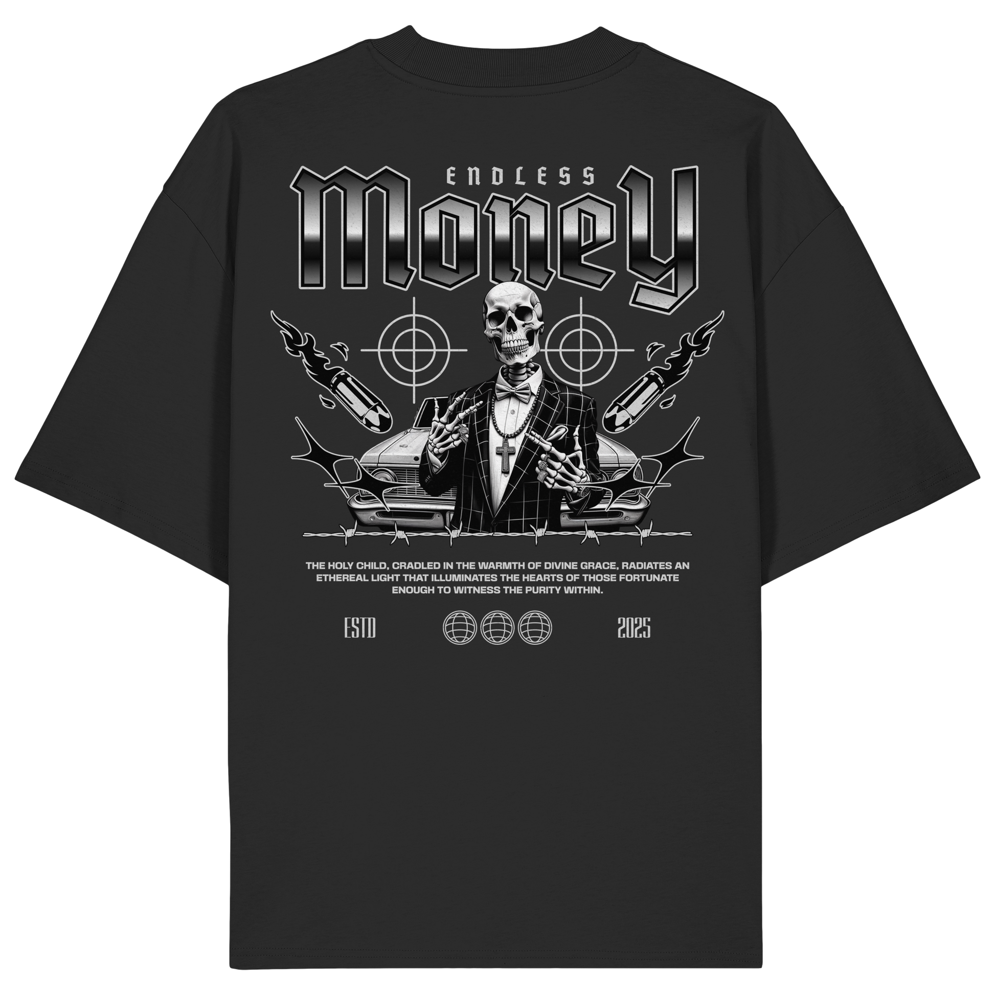 Das Design mit einem stilvollen Skelett, Pistolen und einem klassischen Auto symbolisiert Reichtum und Macht. Die Worte "Endless Money" verstärken dieses Gefühl von grenzenloser Freiheit und Luxus.