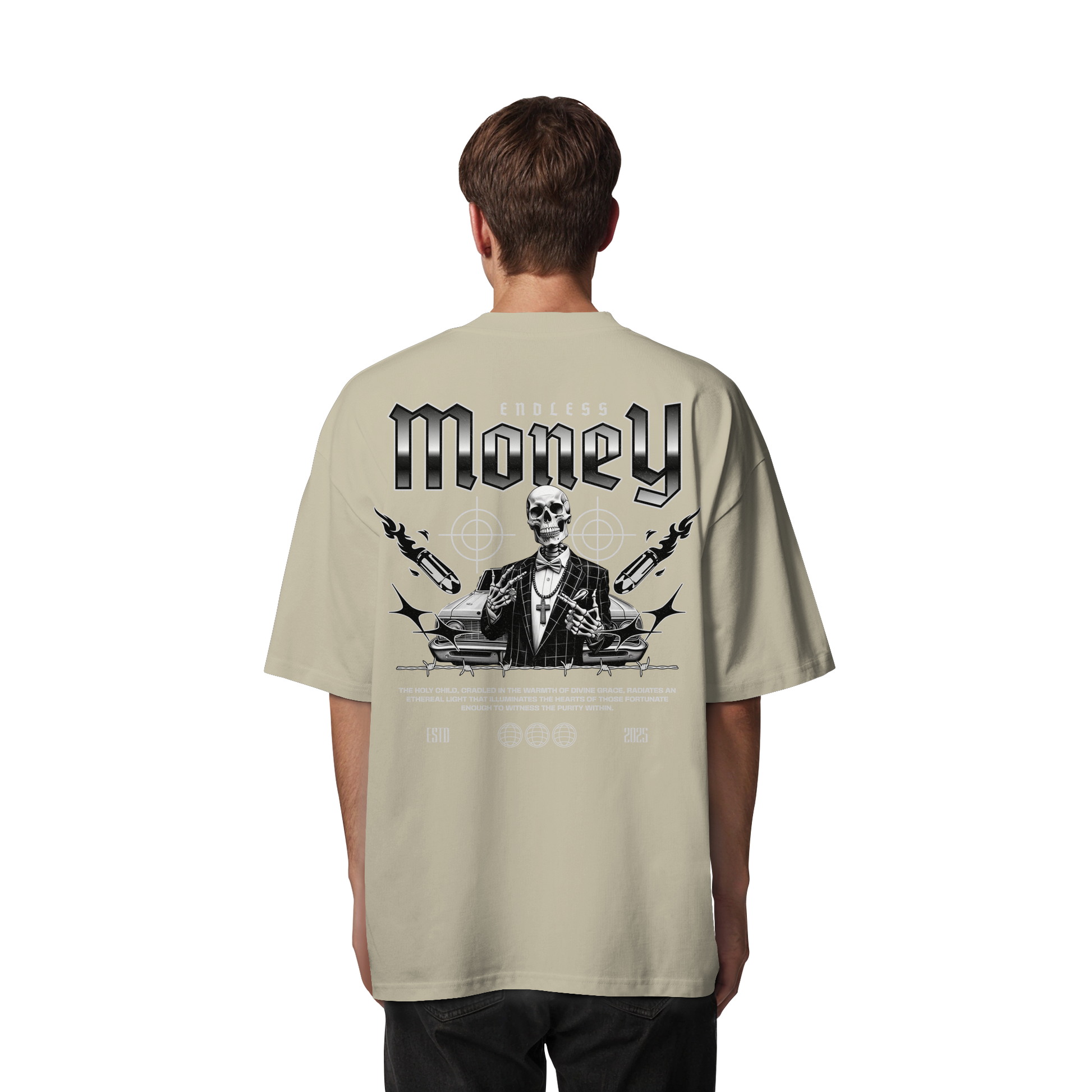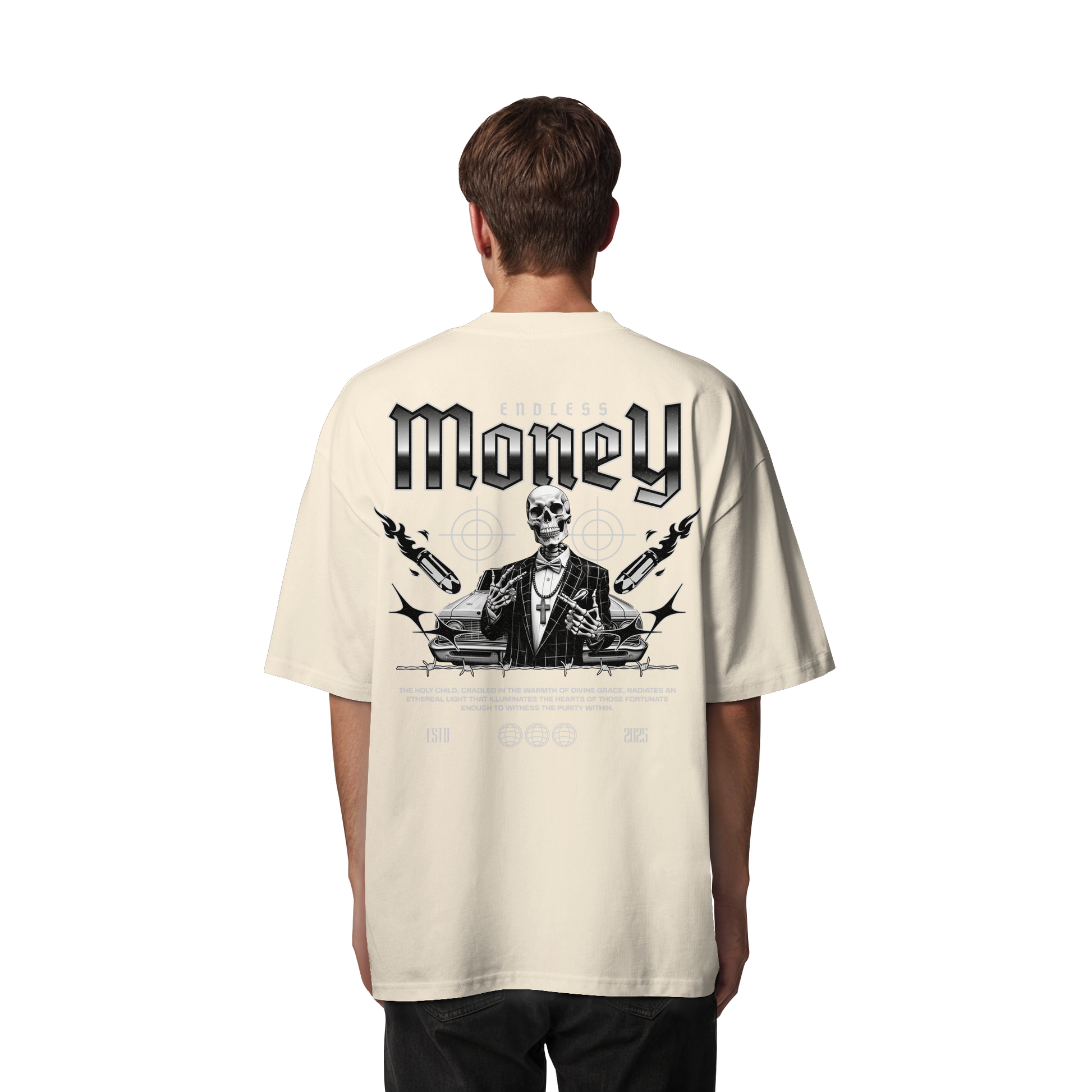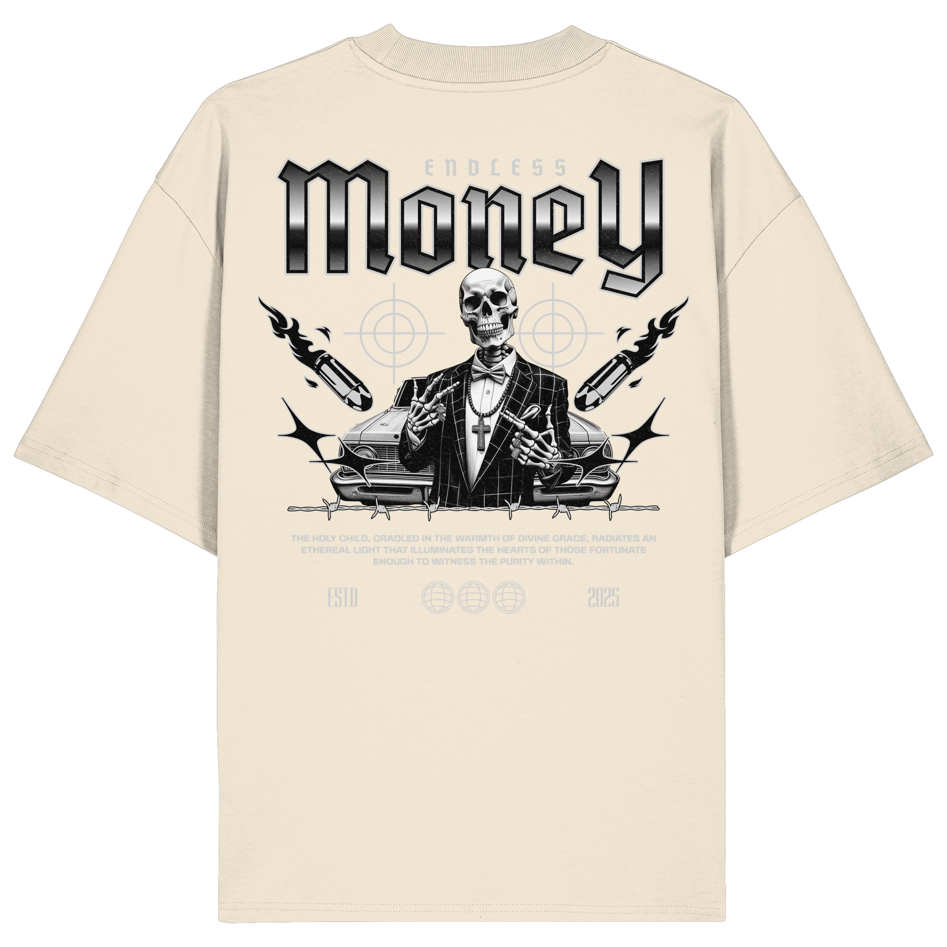 Das Design mit einem stilvollen Skelett, Pistolen und einem klassischen Auto symbolisiert Reichtum und Macht. Die Worte "Endless Money" verstärken dieses Gefühl von grenzenloser Freiheit und Luxus.
