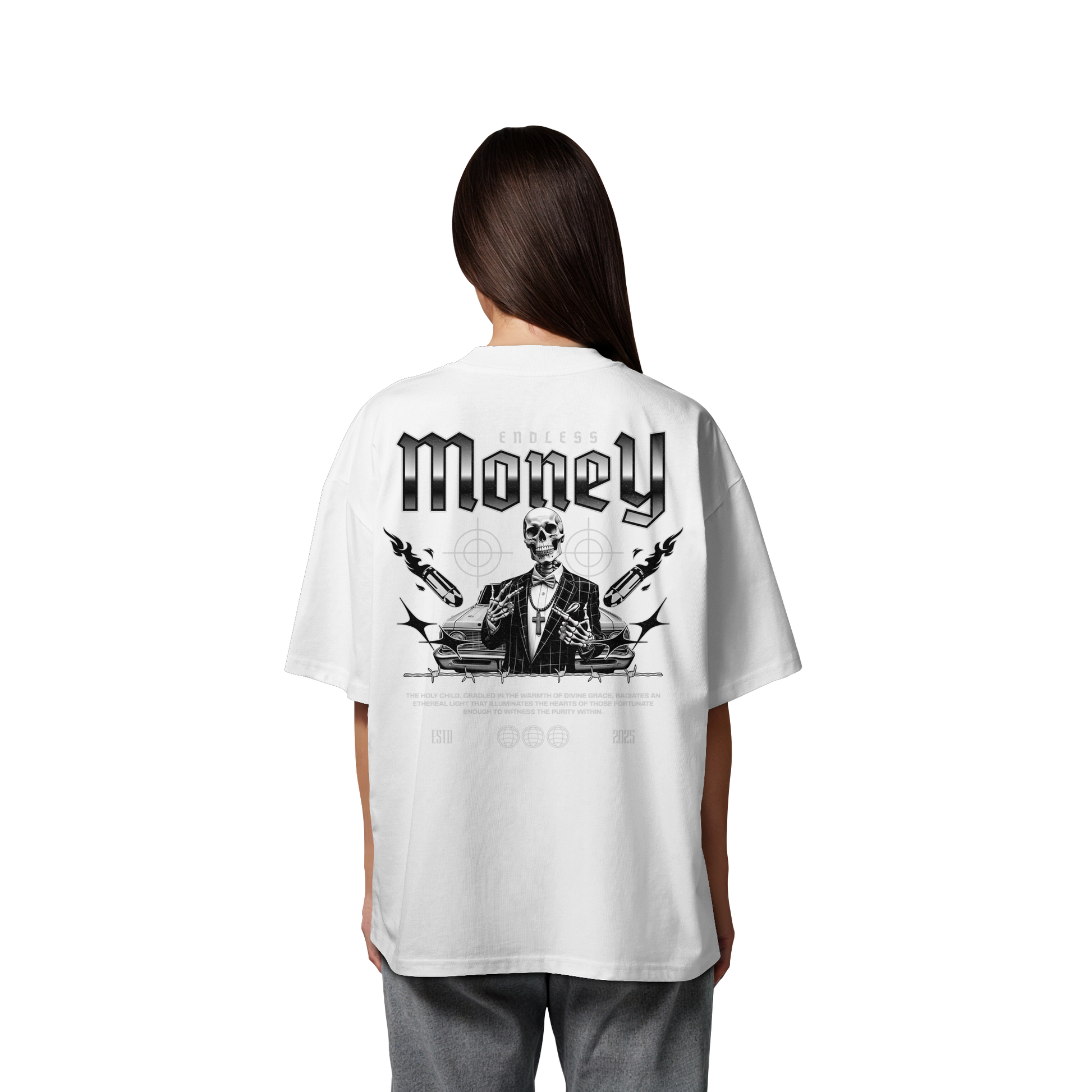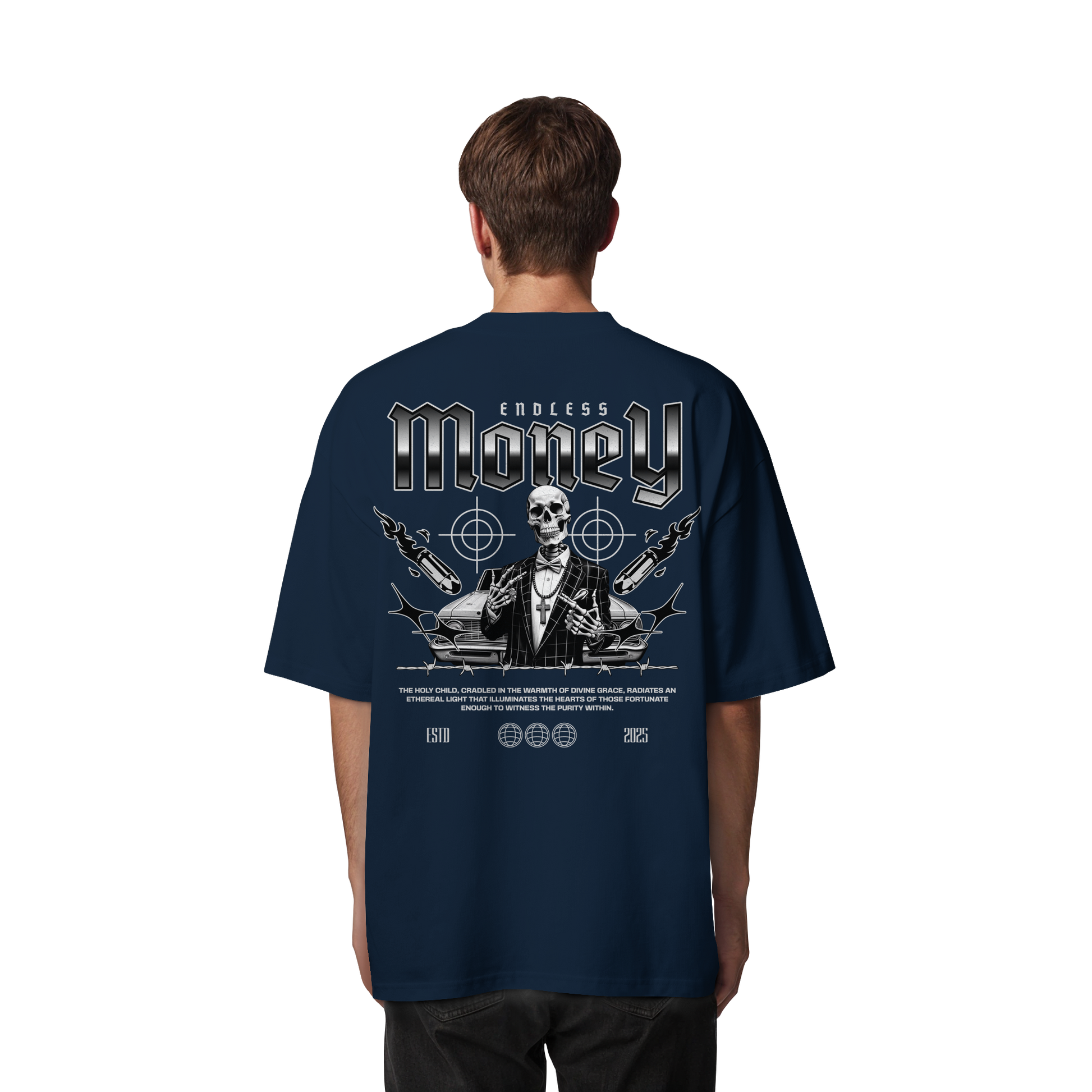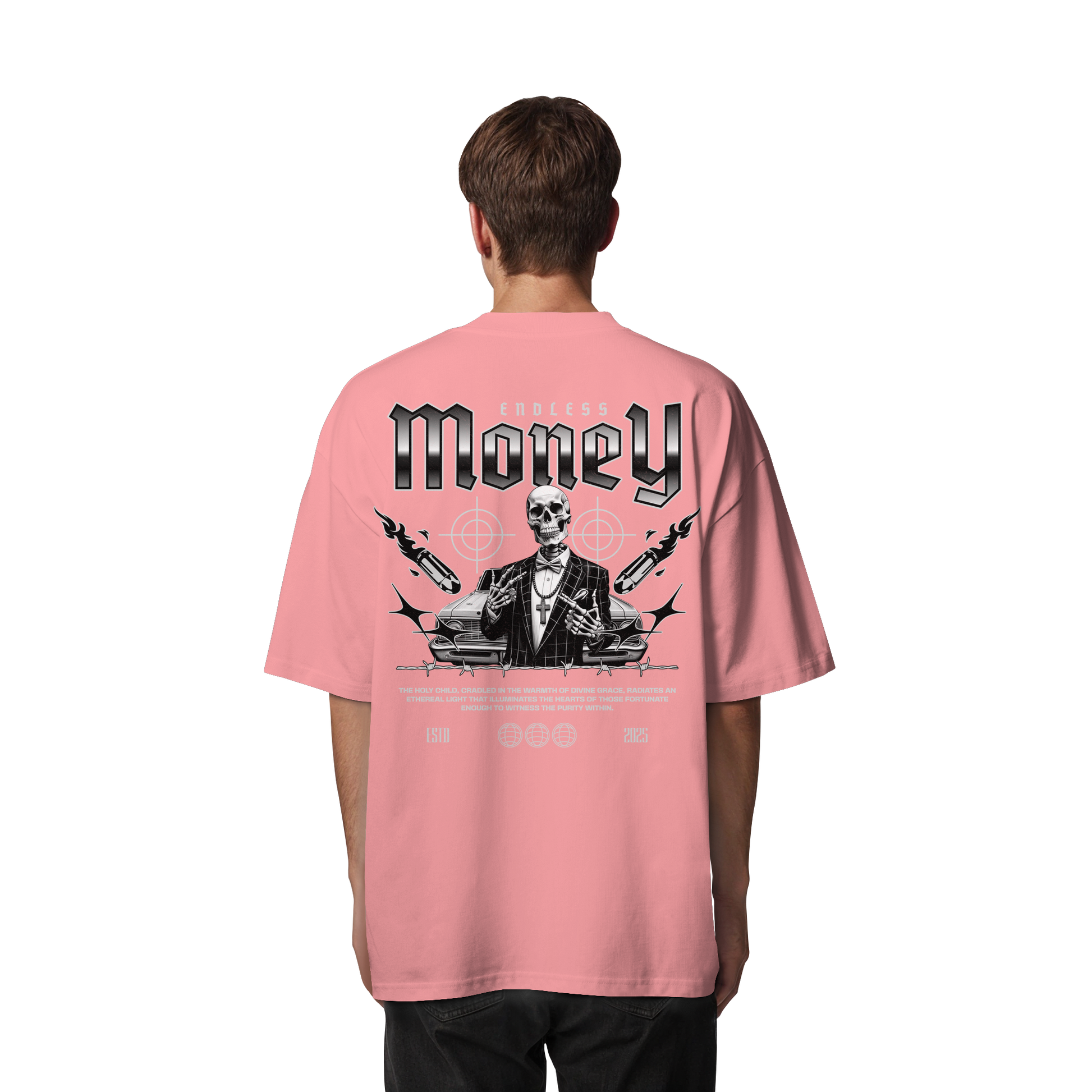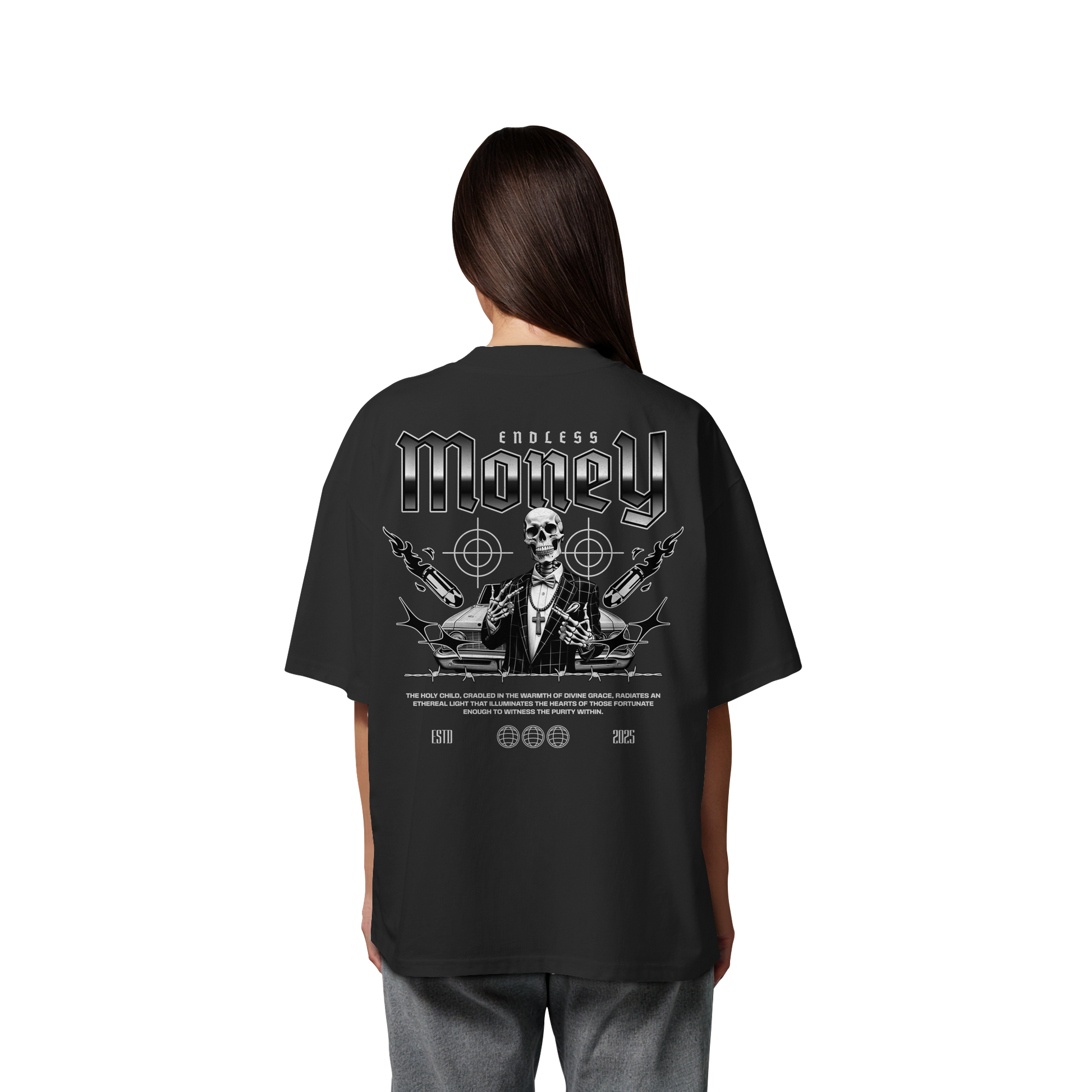 Das Design mit einem stilvollen Skelett, Pistolen und einem klassischen Auto symbolisiert Reichtum und Macht. Die Worte "Endless Money" verstärken dieses Gefühl von grenzenloser Freiheit und Luxus.