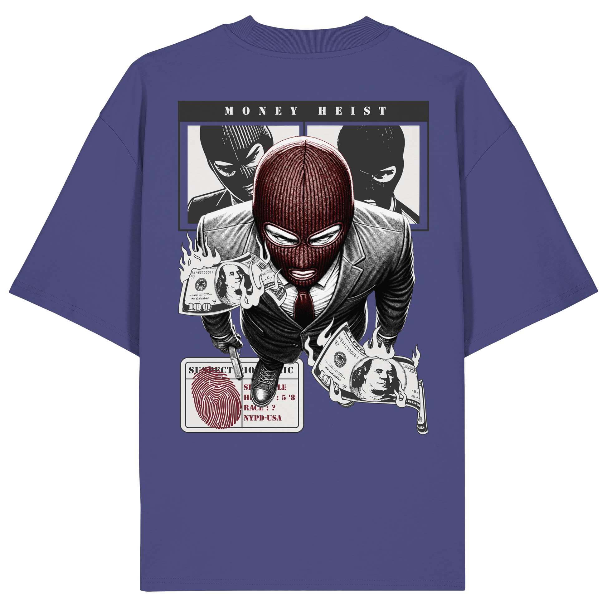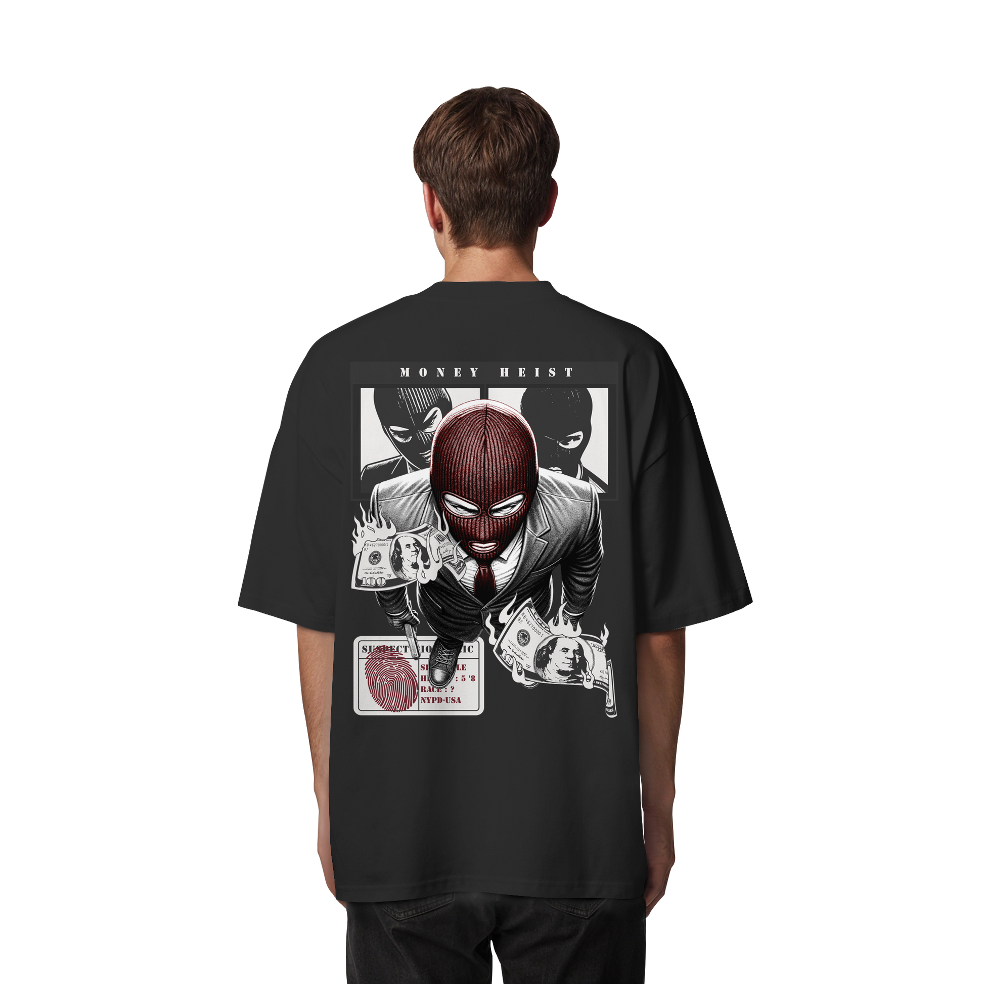 Das Motiv zeigt ein fesselndes Bild eines maskierten Mannes, umgeben von brennenden Geldscheinen, das Abenteuer und Aufregung symbolisiert. Der kontrastreiche Einsatz von Schwarz, Weiß und Rot verstärkt die Dramatik und zieht alle Blicke auf sich.
