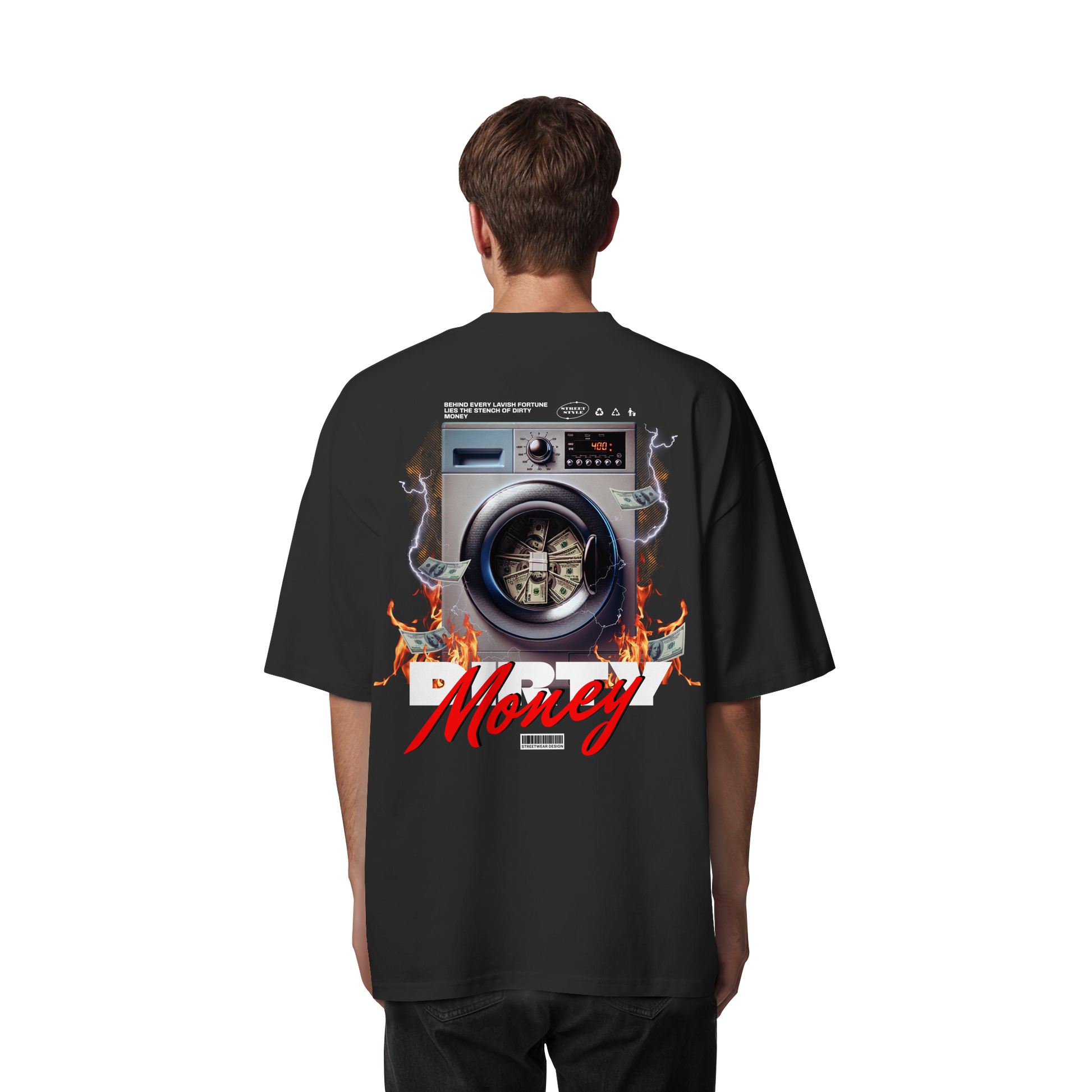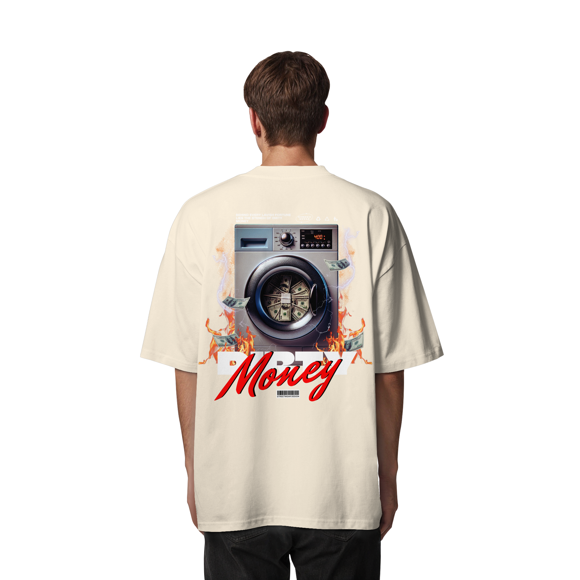 Erleben Sie den rebellischen Charme des Money - Organic Oversize Shirt, das Konzept und Komfort vereint. Dieses limitierte Design zeigt eine Waschmaschine voller Geldscheine, umgeben von Flammen und Blitzen – eine kraftvolle Darstellung von Rebellion und Freiheit.