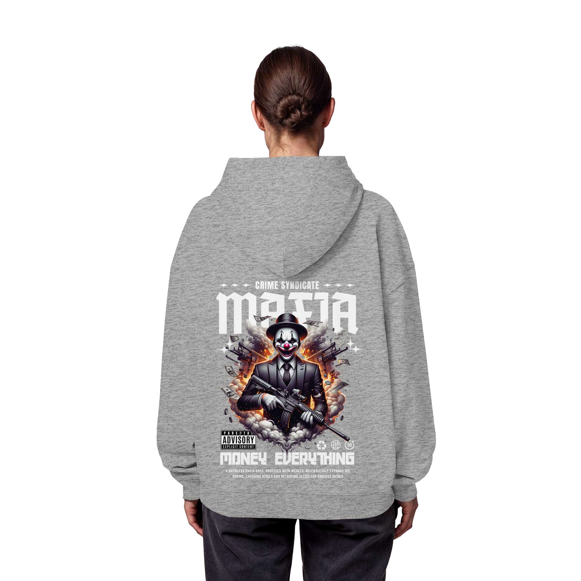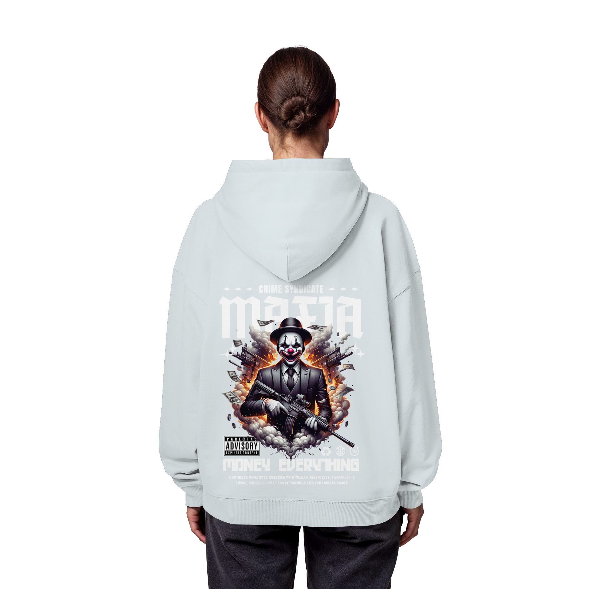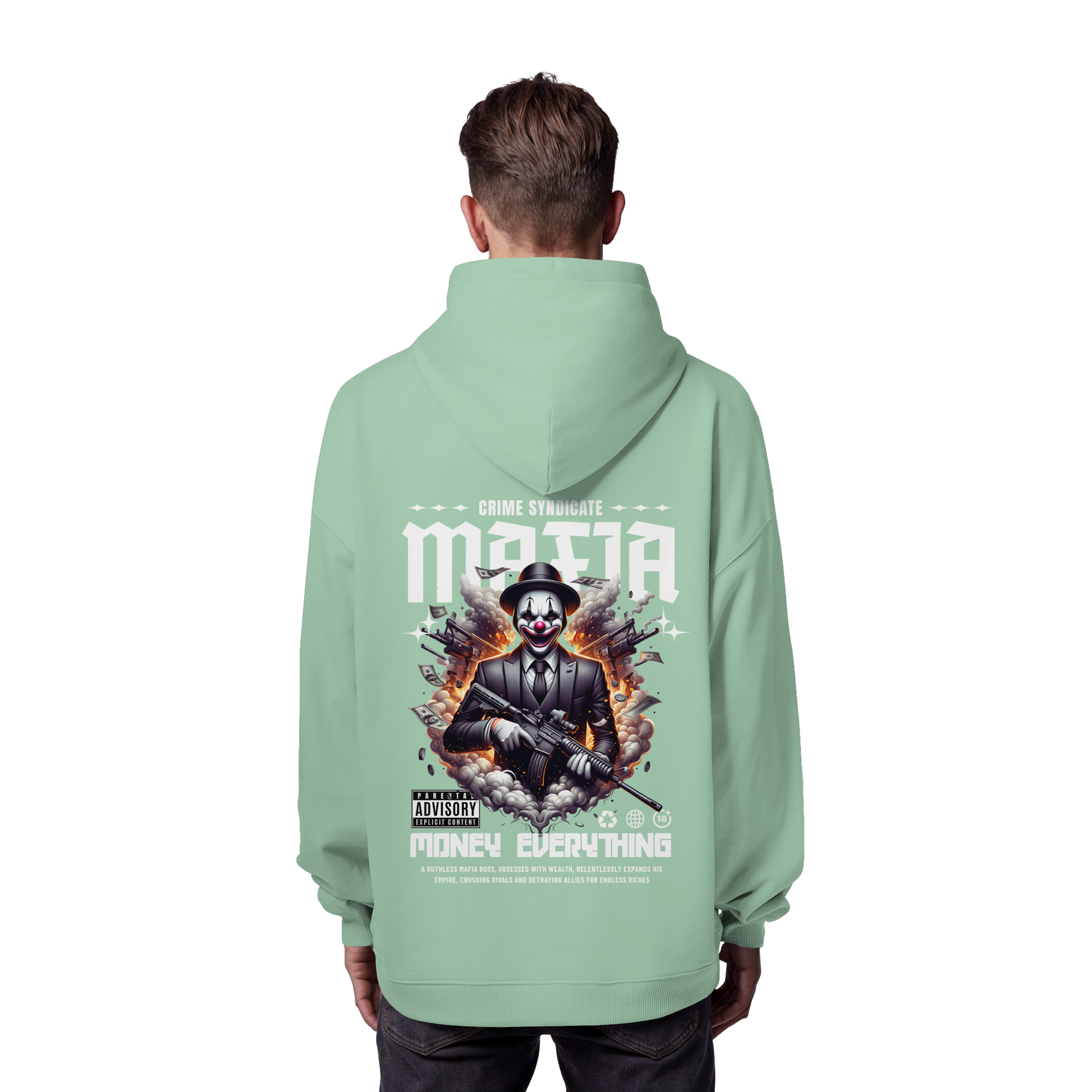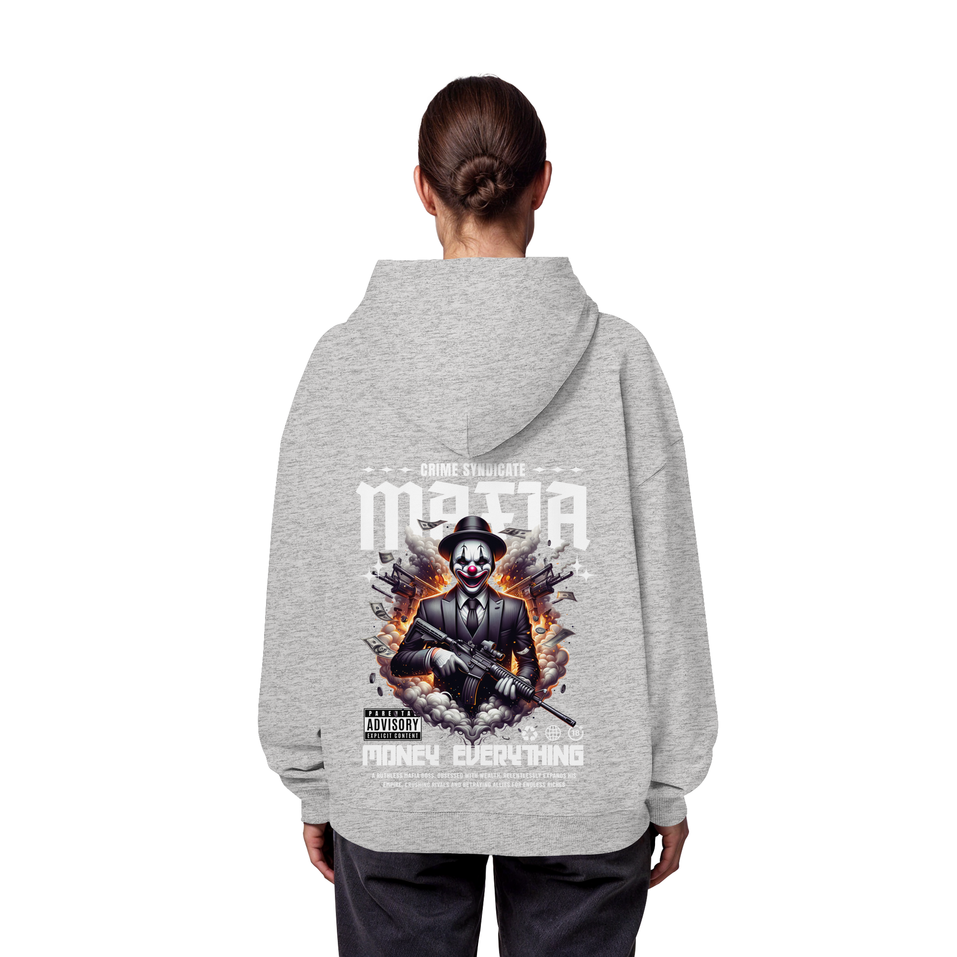 Der „Money - Organic Oversize Hoodie“ vereint urbanen Chic mit einem Hauch von Rebellion. Sein einzigartiges Design mit einem auffälligen Clown-Motiv und Geldscheinen symbolisiert Stärke und Unabhängigkeit.