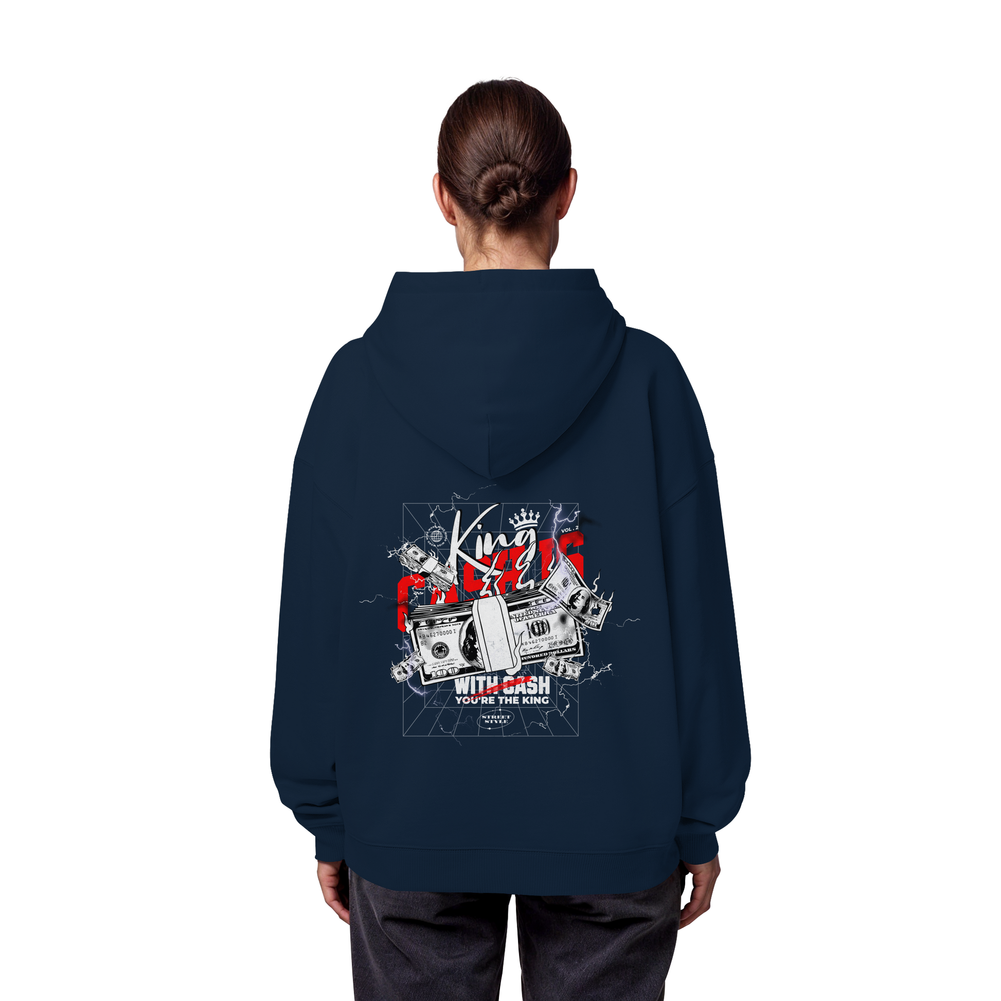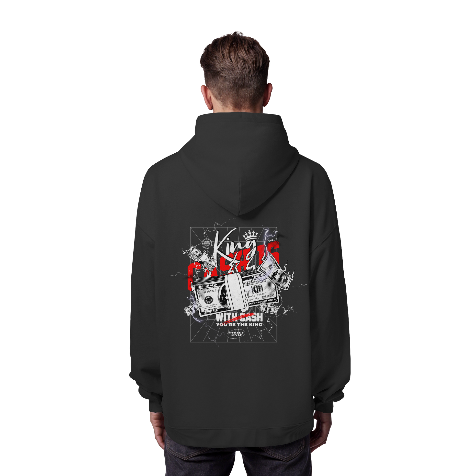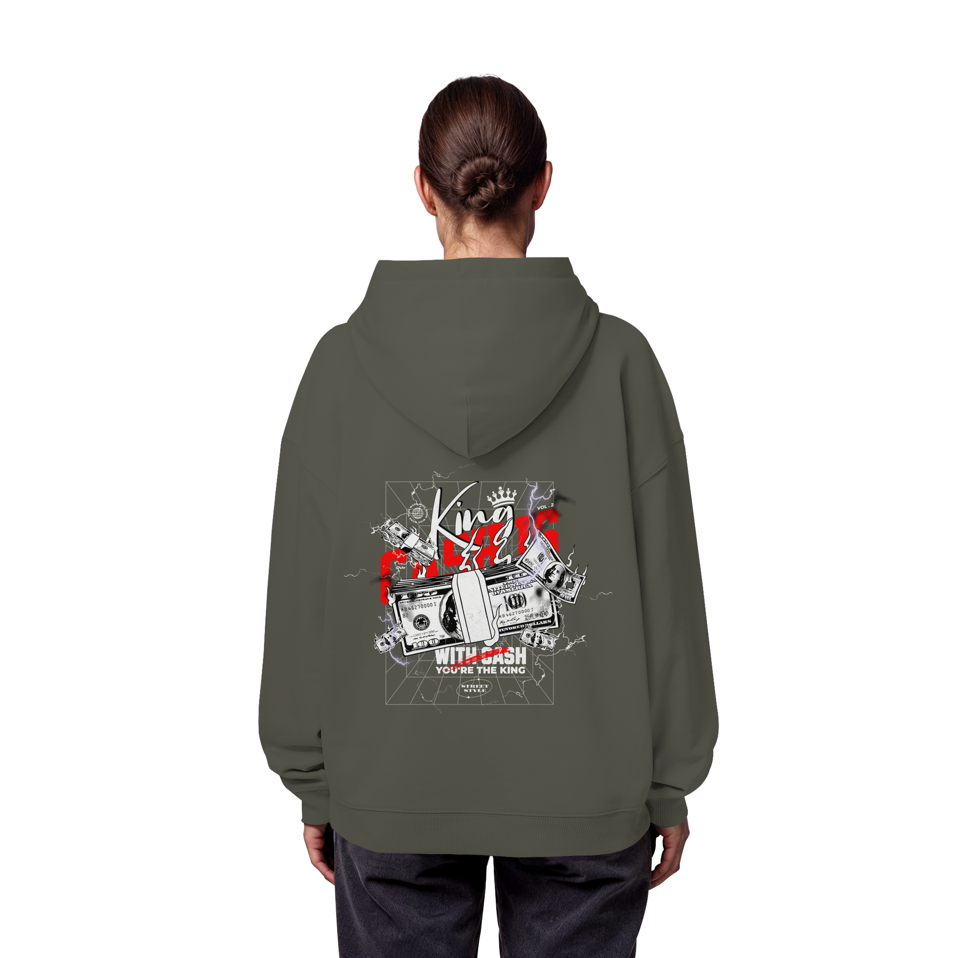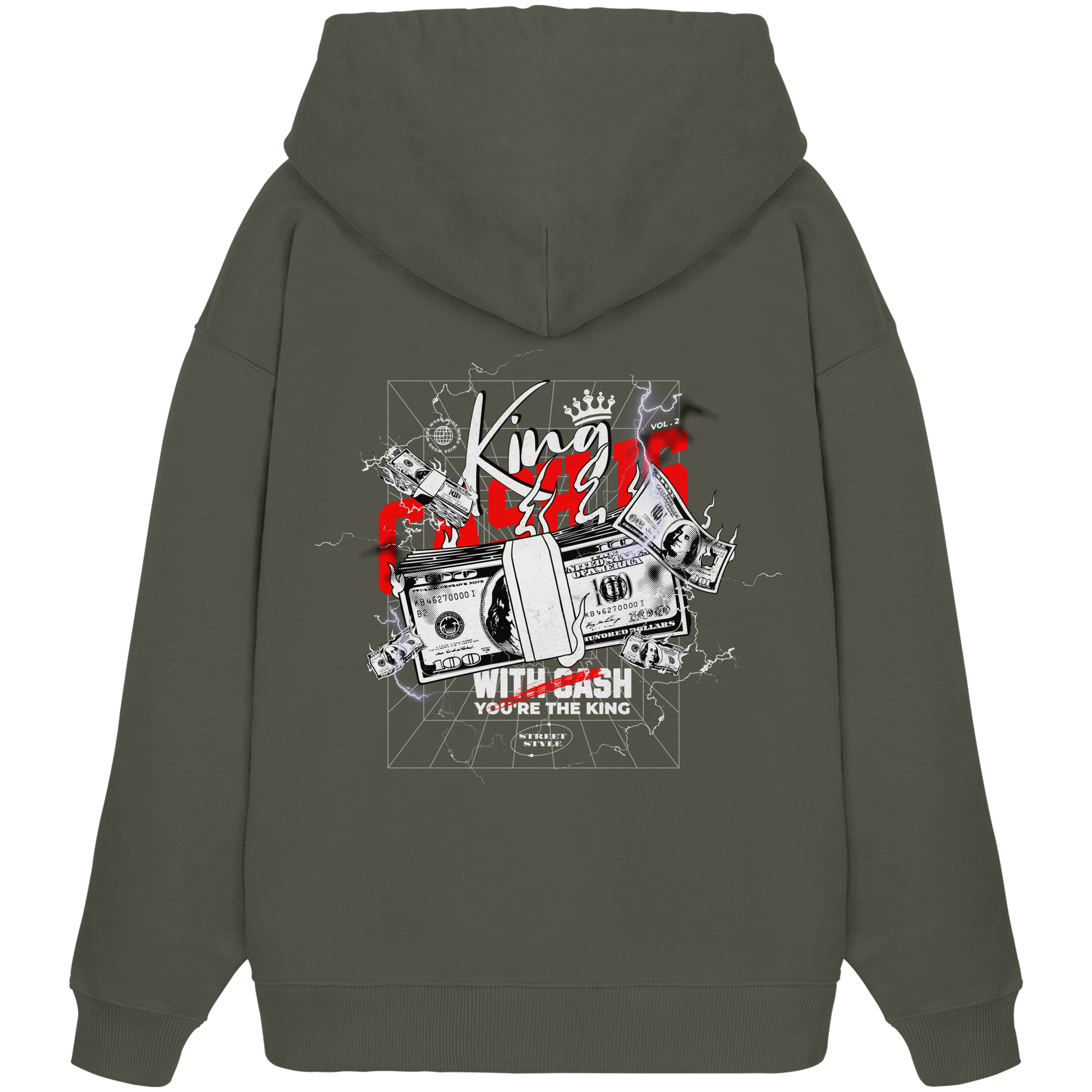 Erlebe den Inbegriff von urbanem Stil mit unserem Money - Organic Oversize Hoodie. Die kühne Grafik aus Geldscheinen und dynamischen Schriftzügen verleiht dem Design eine kraftvolle Botschaft von Erfolg und Ambition.