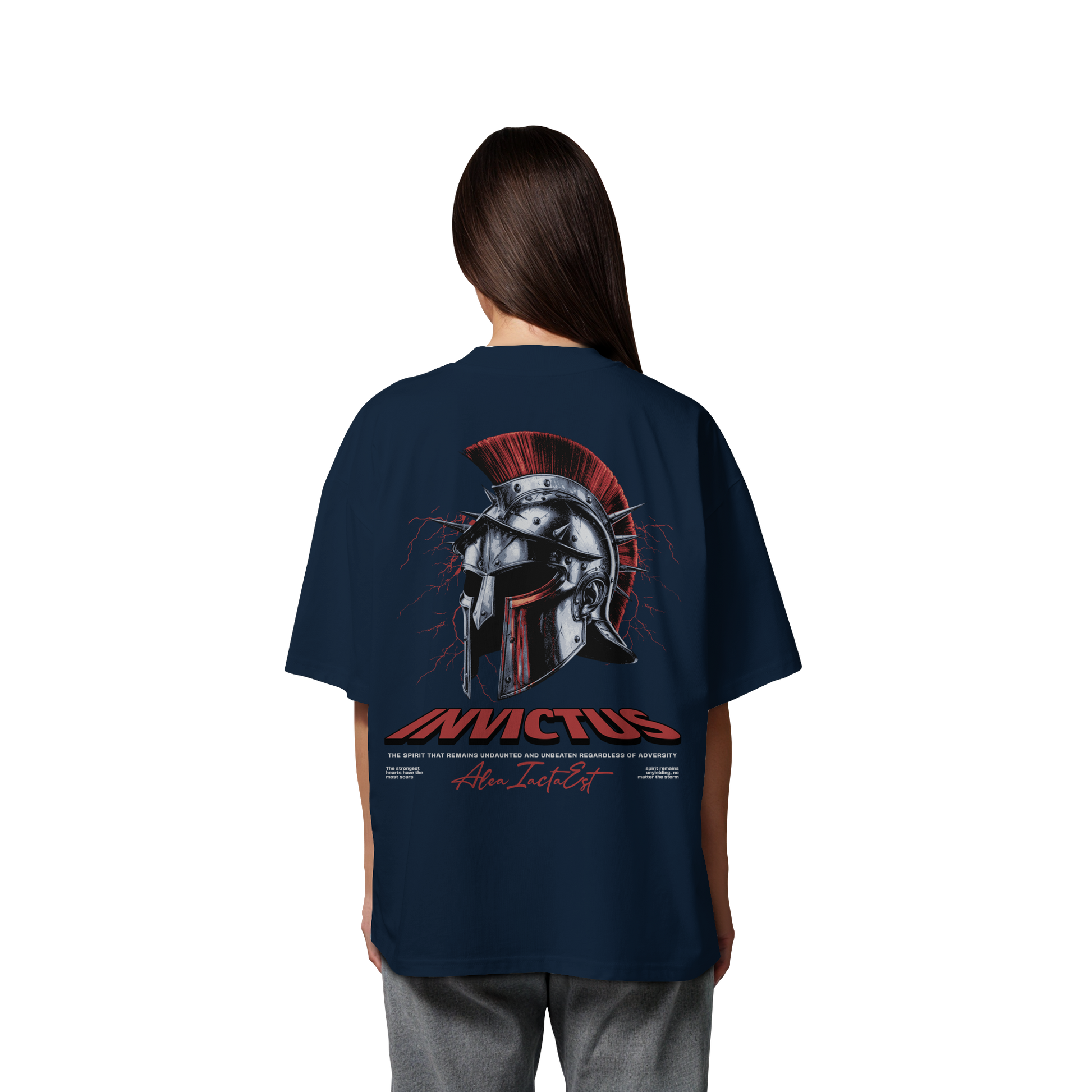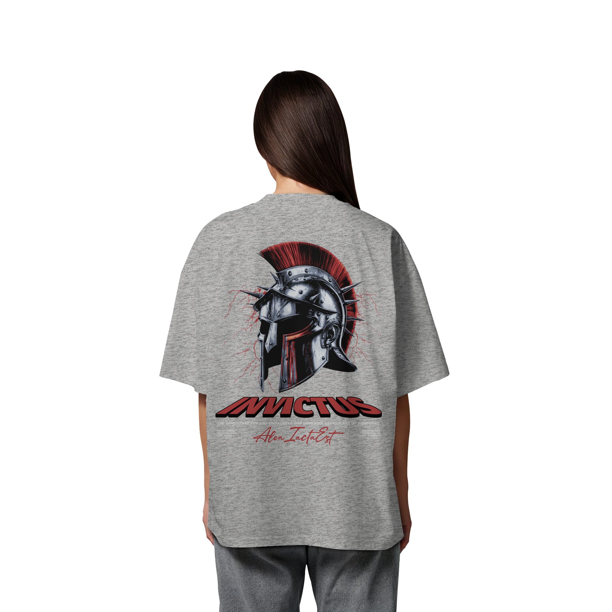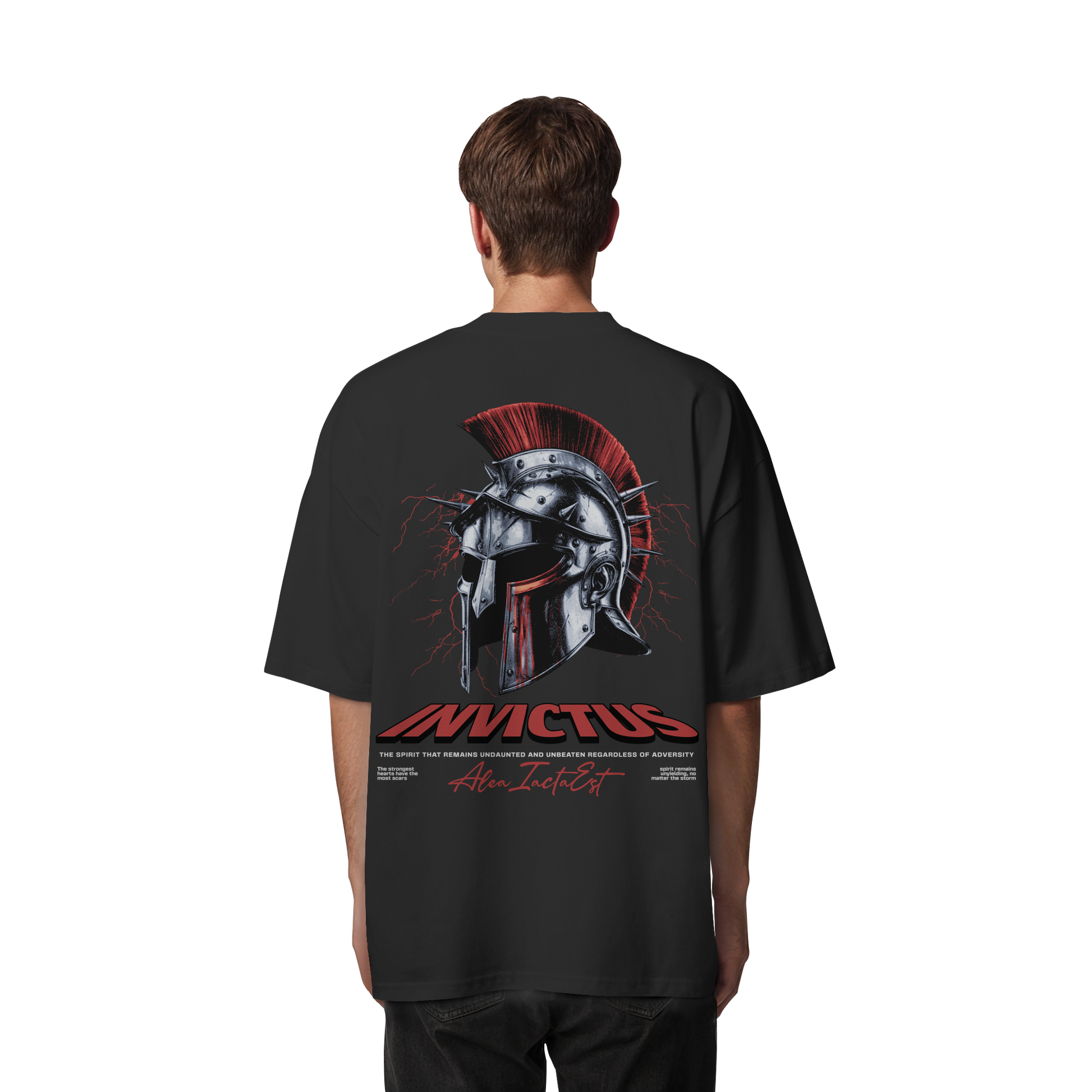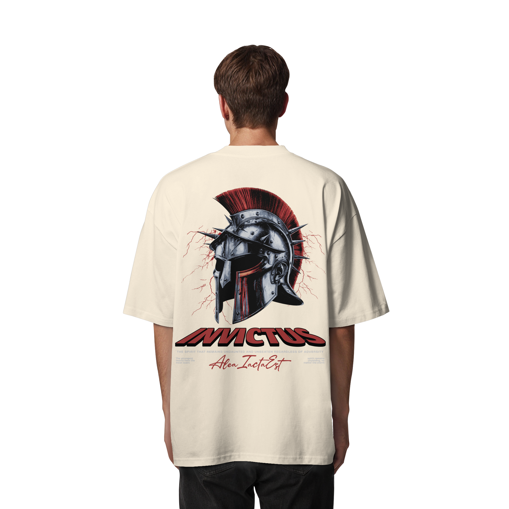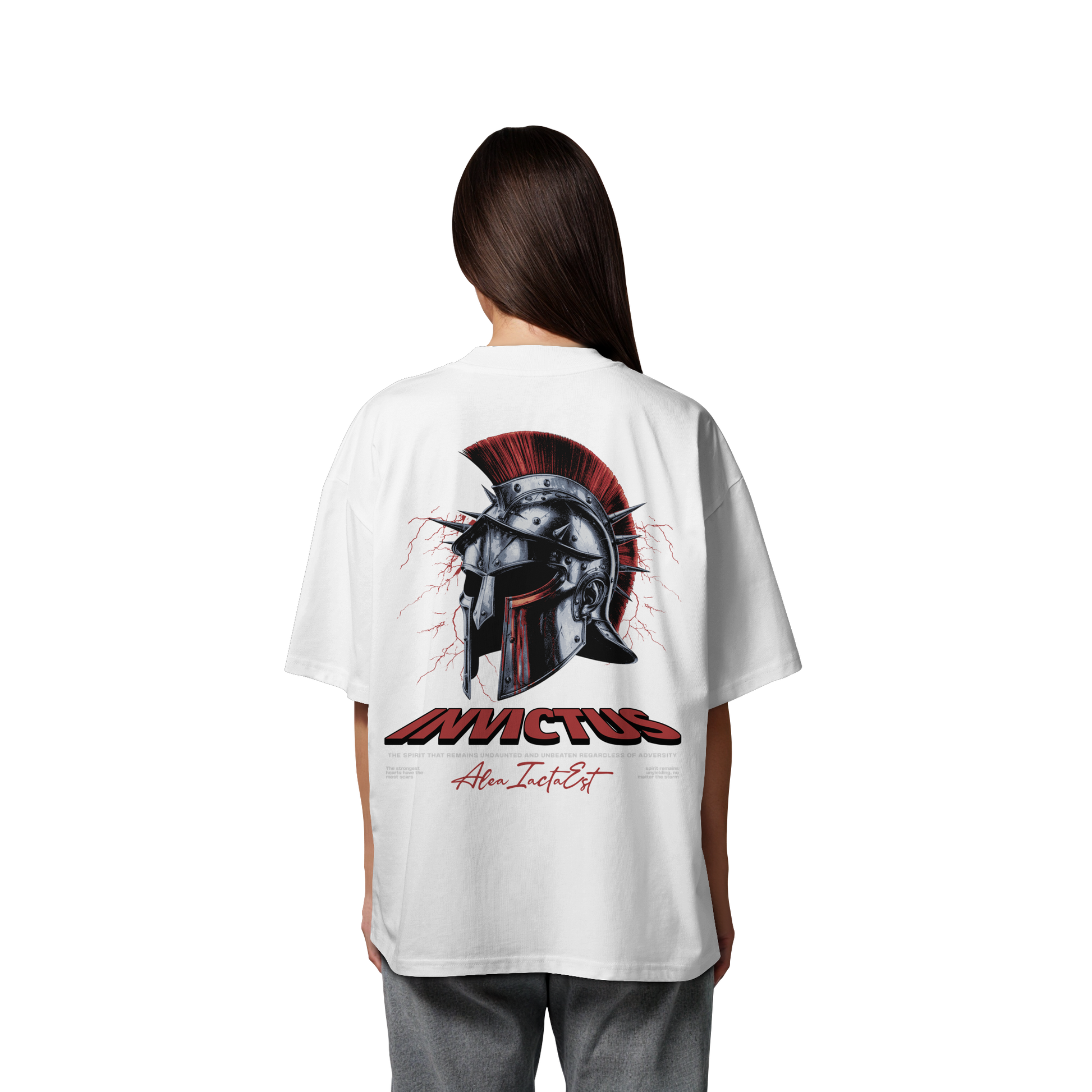 Unser Streetwear - Organic Oversize Shirt mit dem eindrucksvollen "Invictus" Design verbindet urbane Coolness mit einer starken Botschaft. Der imposante Helm und die roten Blitze symbolisieren Stärke und Entschlossenheit. Der weiche, biologische Baumwollstoff umhüllt dich in Komfort und Stil.