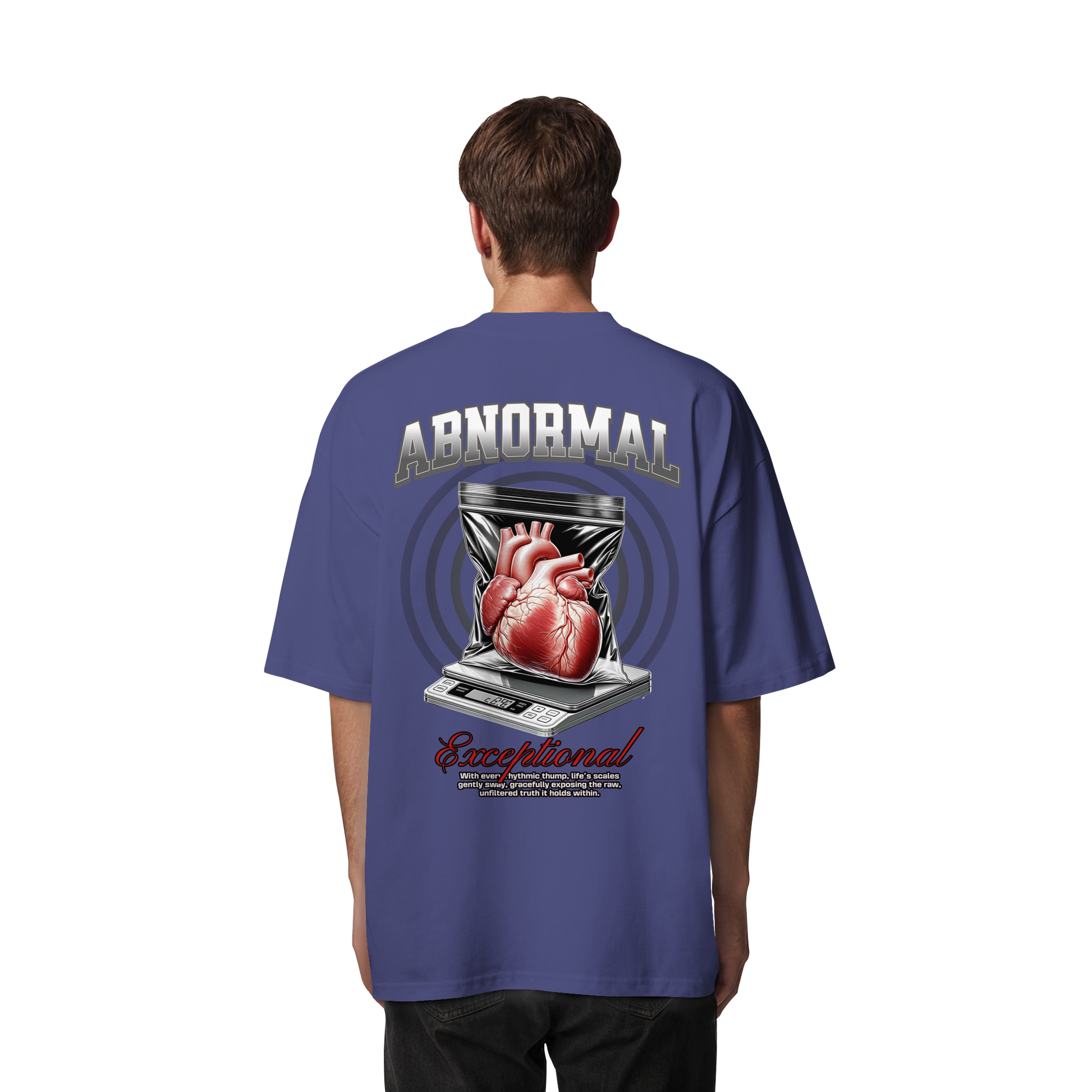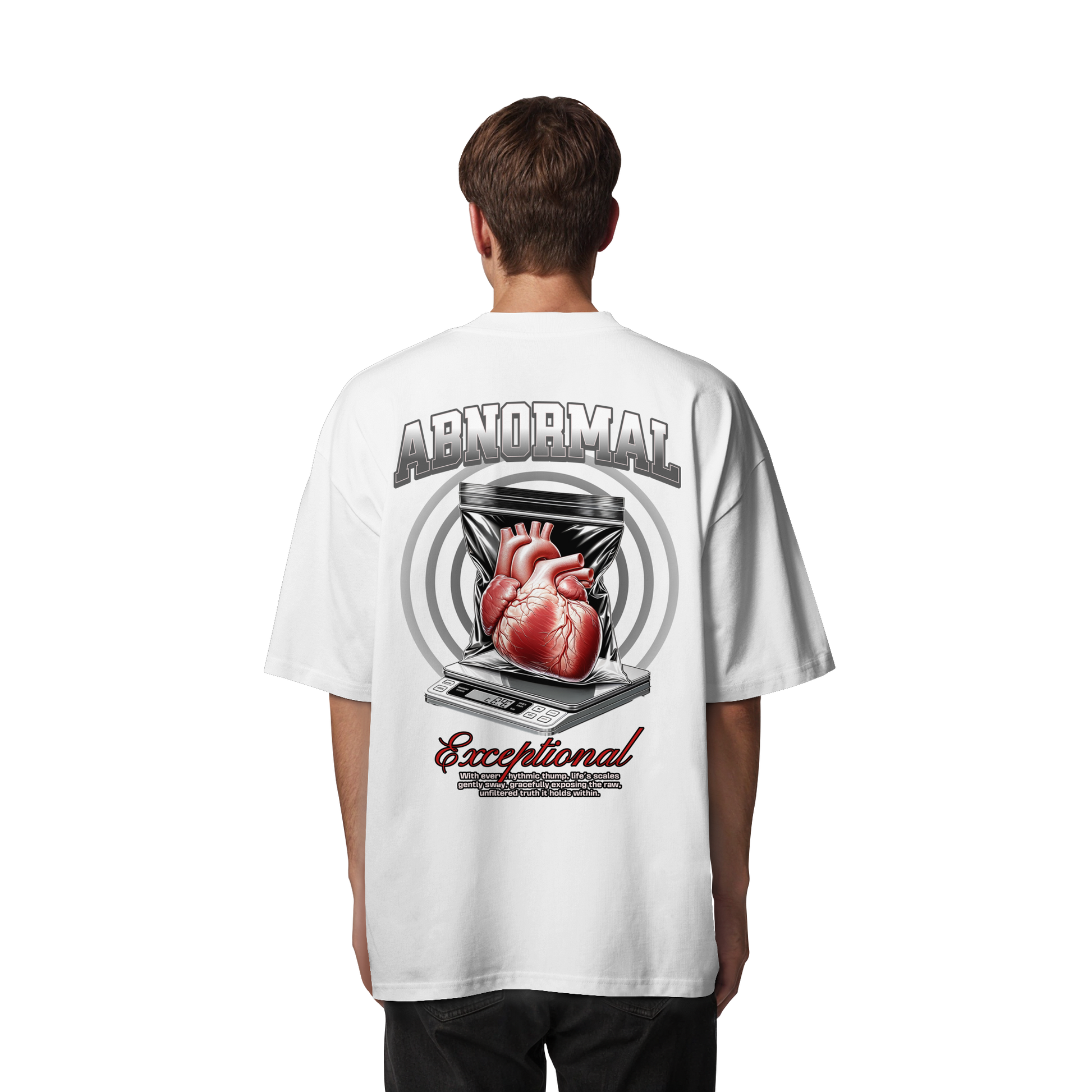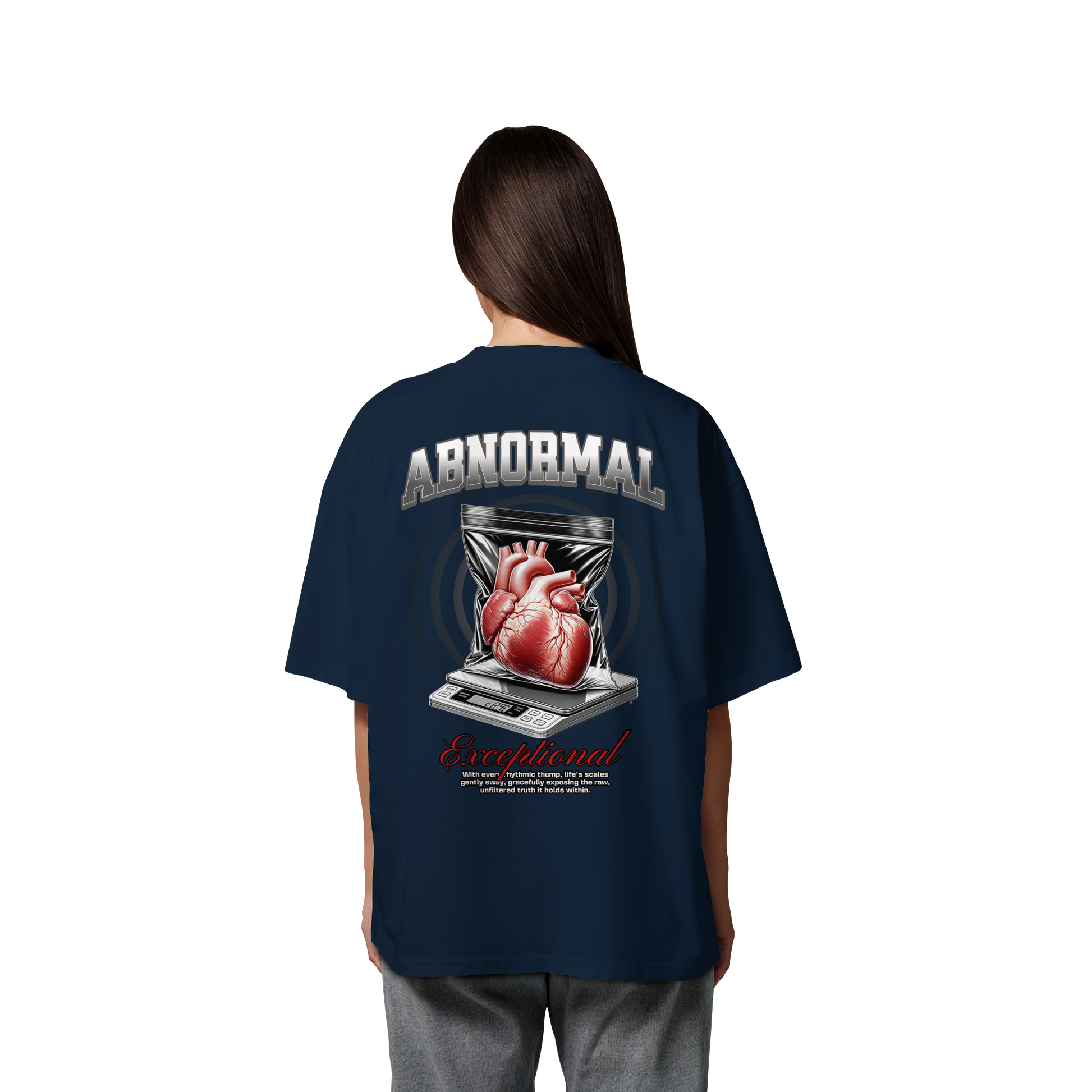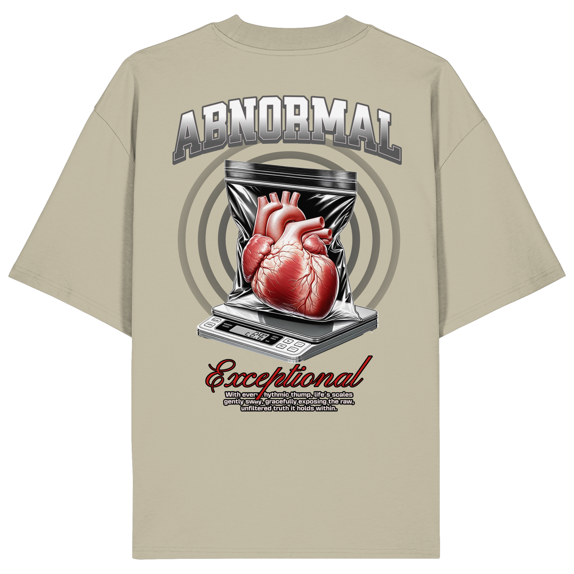 Das Design mit einem Herz auf einer Waage symbolisiert Balance und Individualität. Der kräftige Schriftzug "ABNORMAL" und das Wort "Exceptional" in eleganter Typografie erwecken ein einzigartiges Statement.