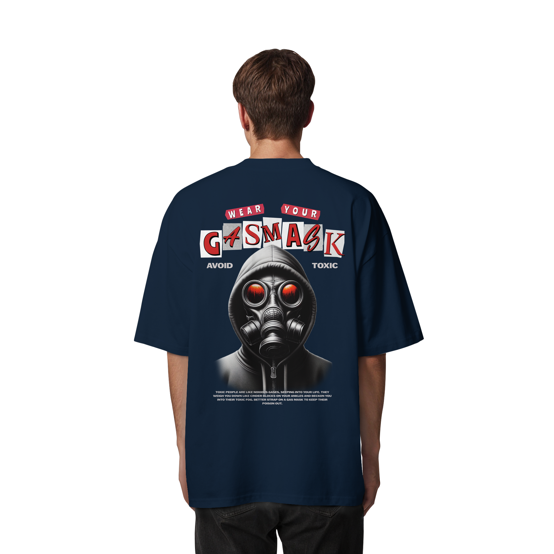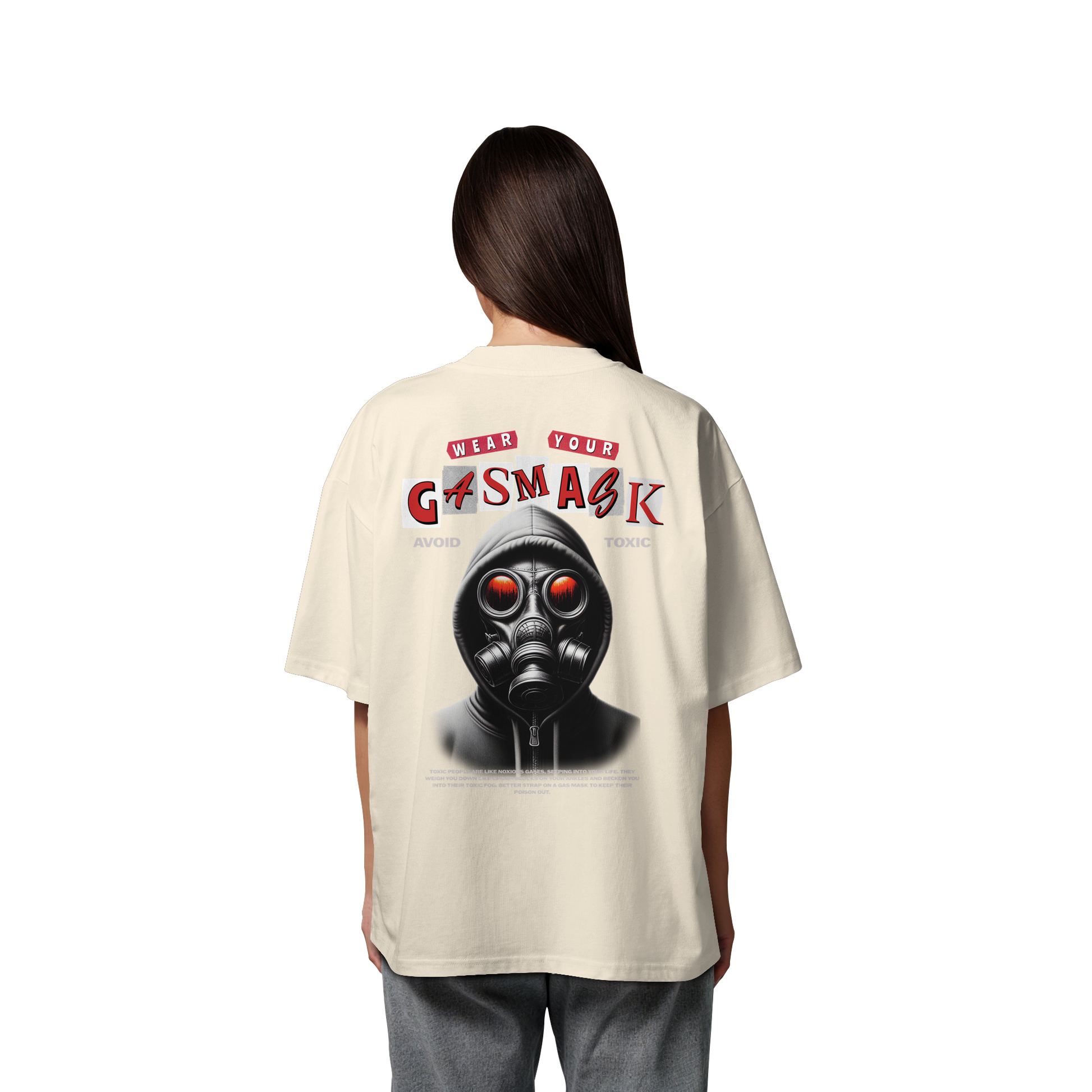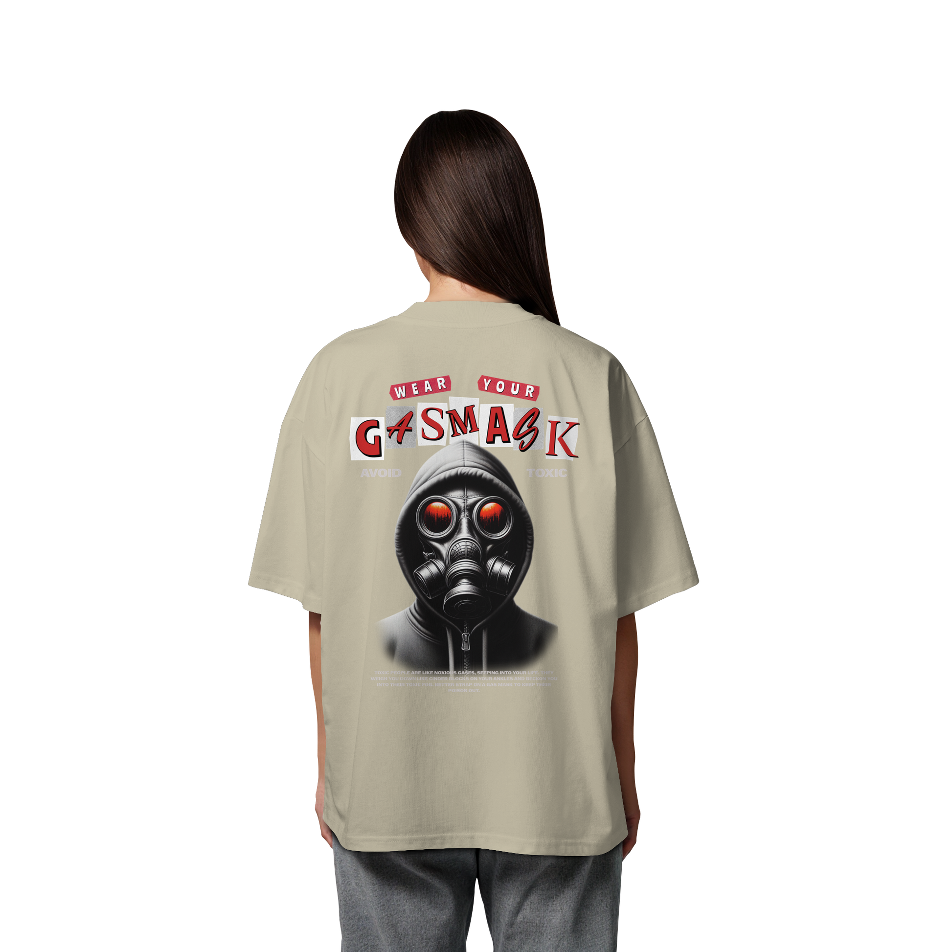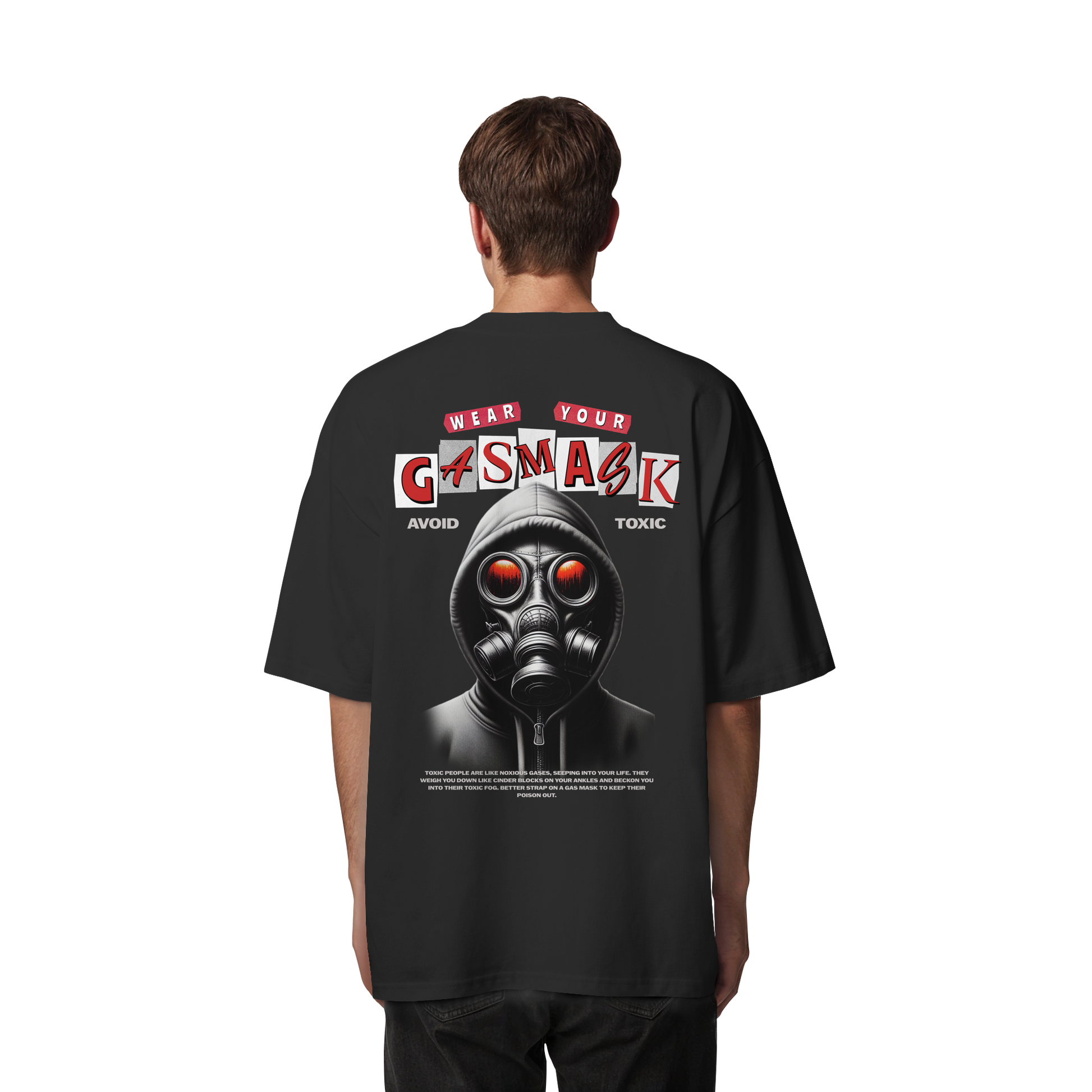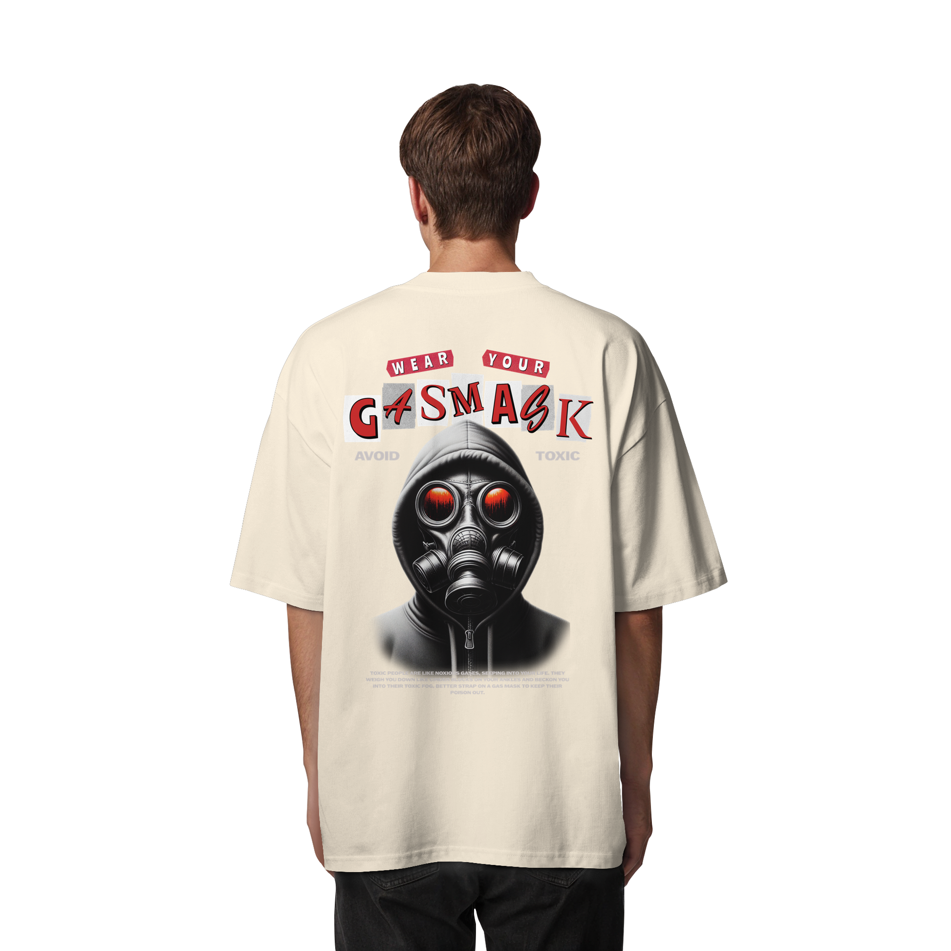Das provokante Design zeigt eine Gasmaske und den Slogan "Wear Your Gas Mask - Avoid Toxic" und spricht die Themen Umweltbewusstsein und Selbstausdruck an.